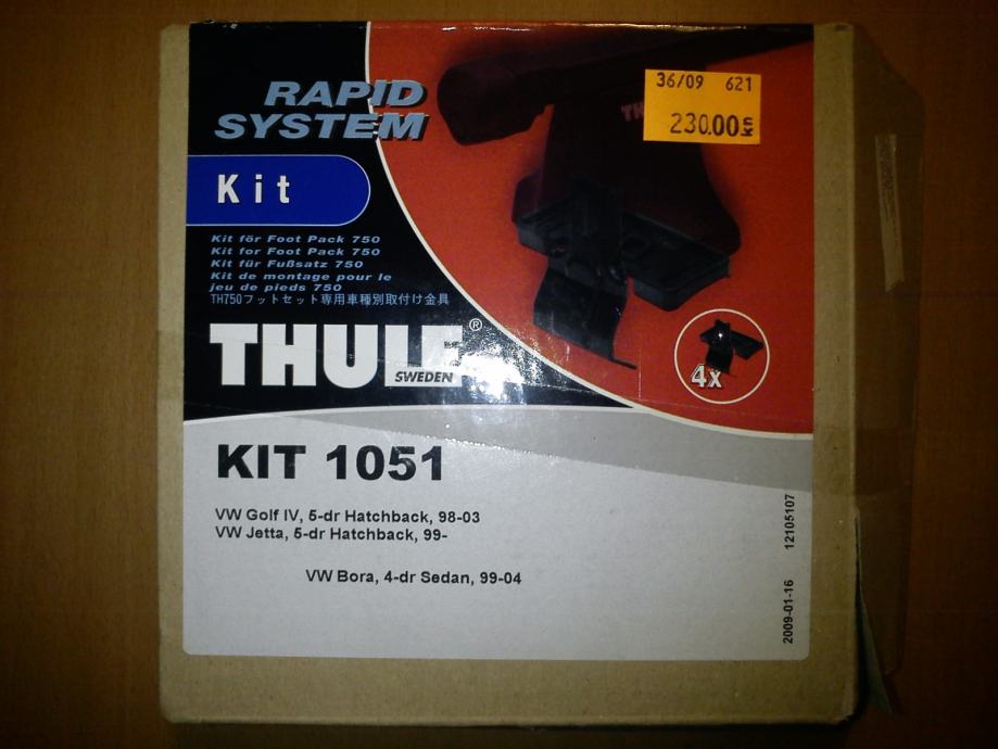 Prodajem THULE kit 1051 za VW Golf IV 5 vr. 98-03, VW Jetta 99-, VW Bora 99-04. Malo korišten. Cijena 120 kn.