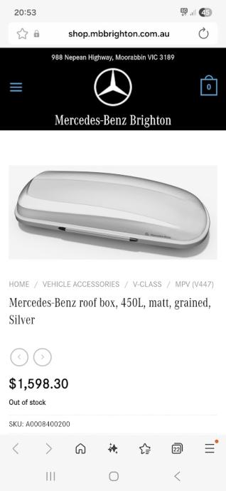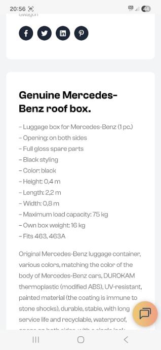 Prodajem krovnu kutiju za Mercedes 220x80x40 450l. Kutija se otvara na obje strane. Cijena kutije je 270€. Prodaju se i krovni nosači za Mercedes C-Class (W204) od 2007-2014 i Mercedes E-Class (W212) od 2009-2017. Cijena krovni nosača je 200€.