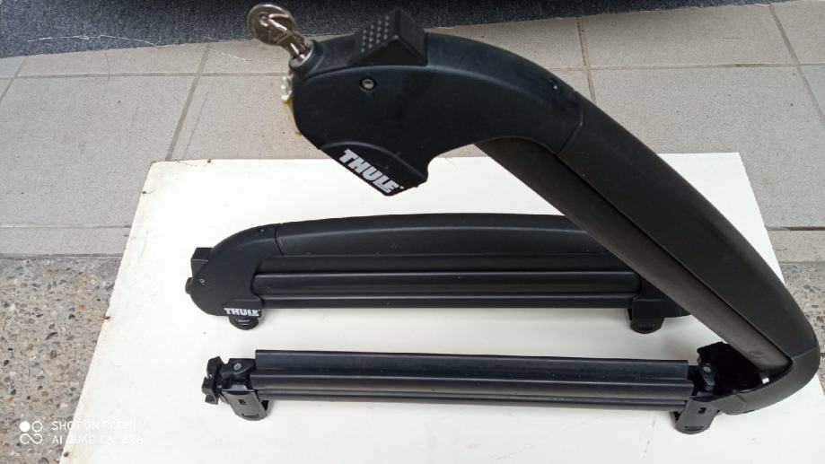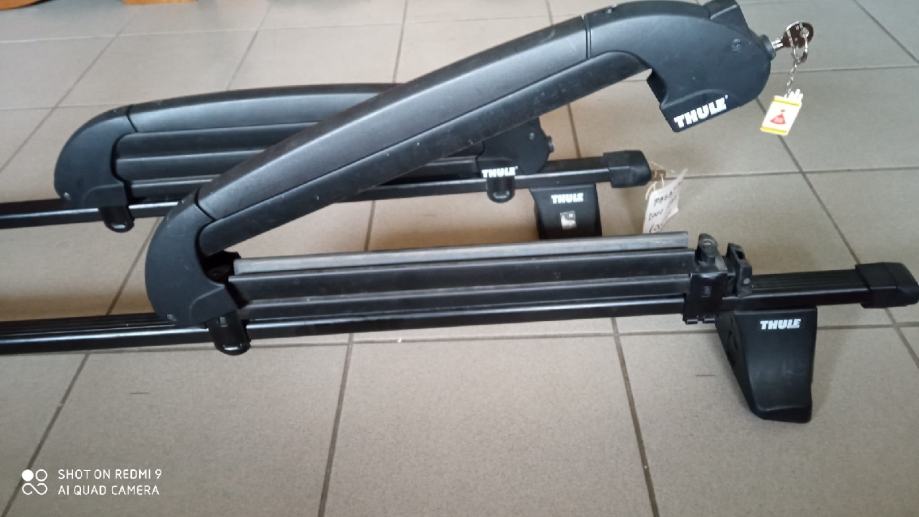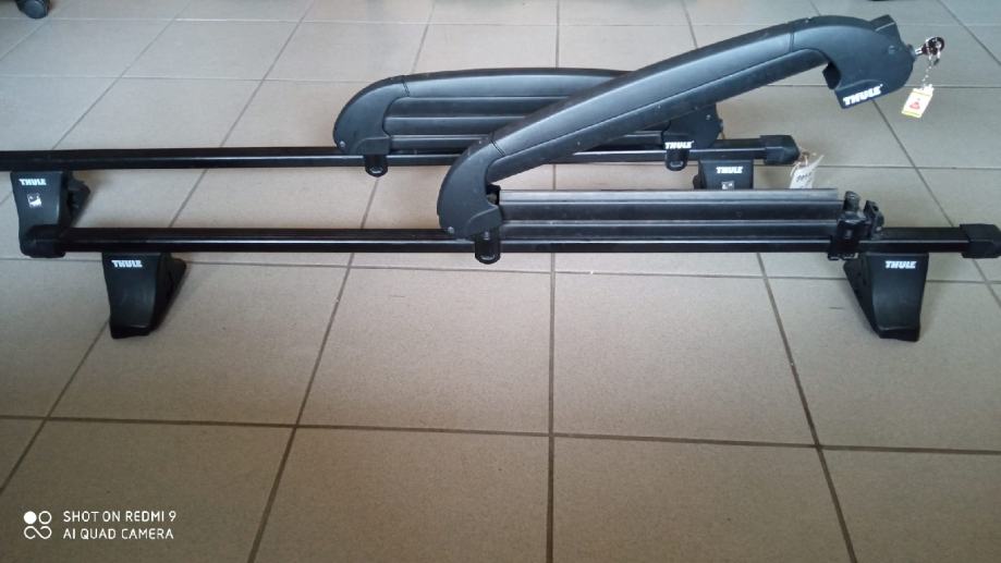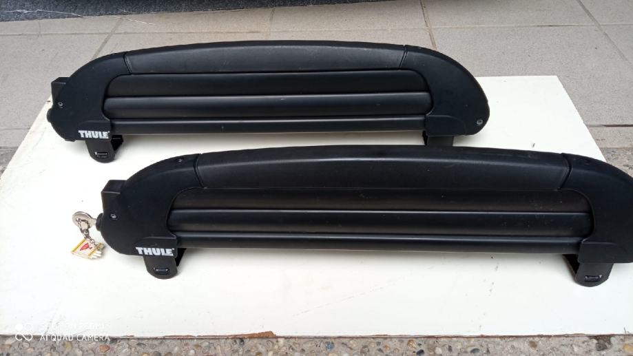 Prodajem THULE krovne nosače za 4 para skija ,crni metalni plastificirani sa bravicama i ključem za zaključavanje .potpuno sačuvani bez ikakvog traga oštećenja.