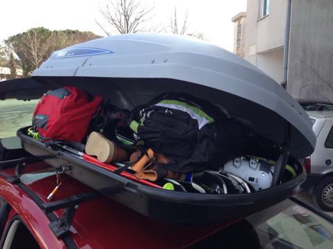 *unutra stane 4 para skija, stapovi, 4 para pancerica, 2 velika ruksaka, 4 ski odijela i 4 para cizmi!