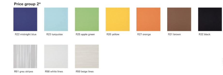 Na raspolaganju je velik izbor boja tkanina i dvije vrste materijala - jednobojni dekor koji propušta svjetlo (cjenovna grupa C) i jednobojni dekor koji propušta svjetlo s premazom bisernog sjaja za zaštitu od topline (cjenovna grupa B).