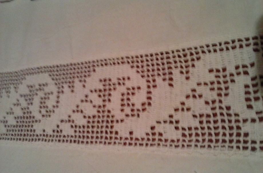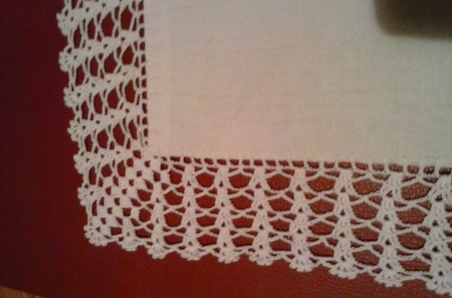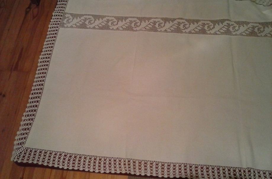 Stolnjak od domaćeg tkanog platna (laneno), čipka rađena od pamučnog konca, dimenzije 180x142 cm, sve izrađeno ručno od branja lana, prerade te tkanja platna, šivanje i heklanje (čipka nije prišivena već bodena u platno). NOVO!!!!!!!