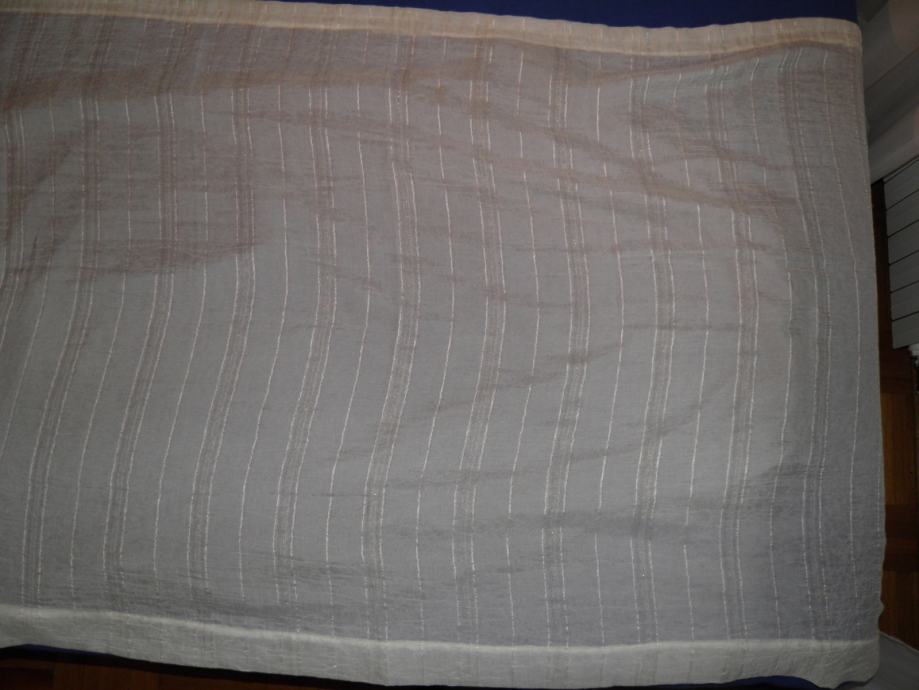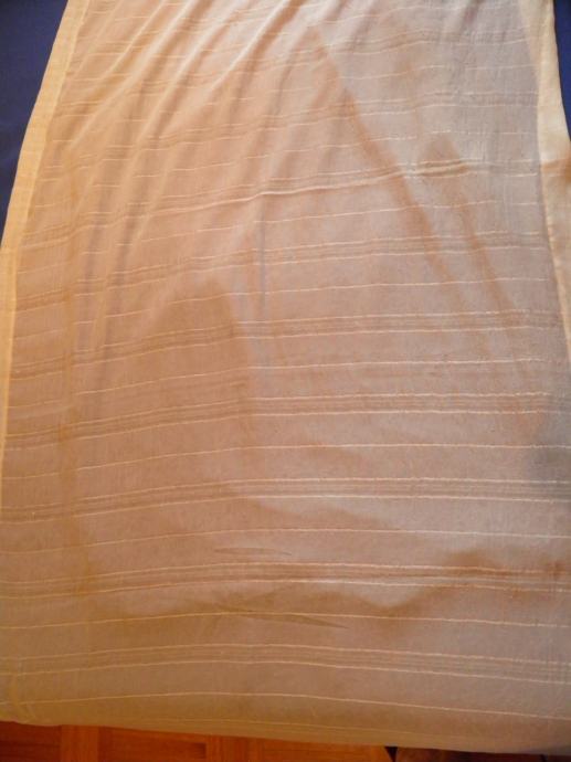 KUHINJSKA ZAVJEZA. VISINA 103, DULJINA 243. U ODLIČNOM STANJU, PREKRASNA BIJELE BOJE, SJAJNA SA UTKANIM ZLATNIM I SREBRNIM KONCEM. MATERIJAL NEŠTO KAO VISKOZA, NIJE POTREBNO PEGLANJE.