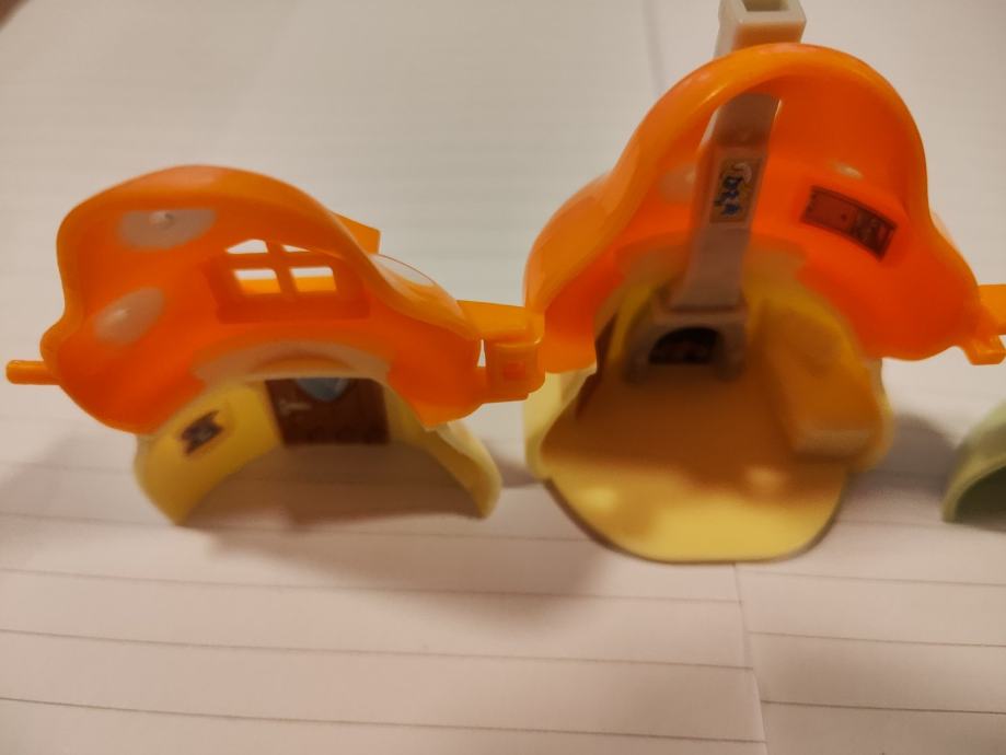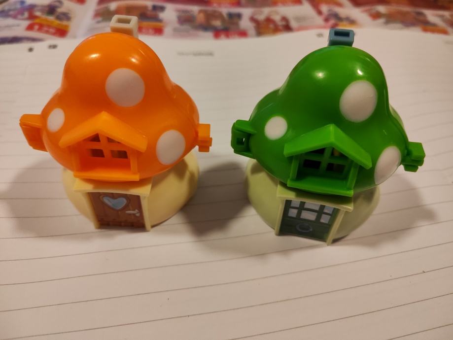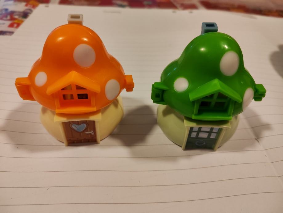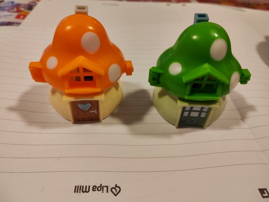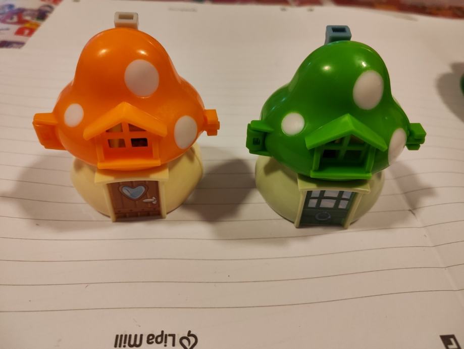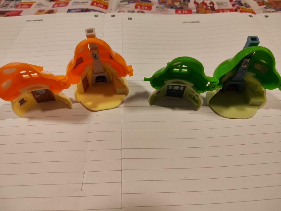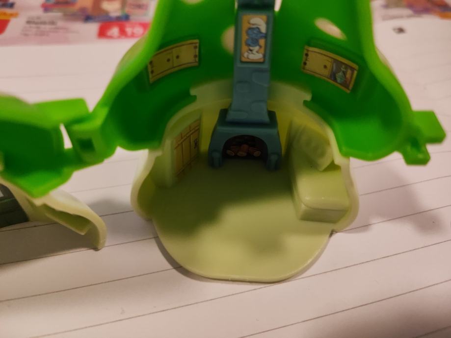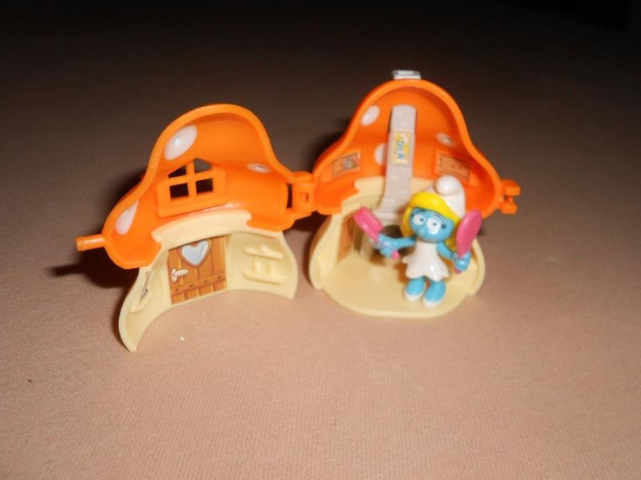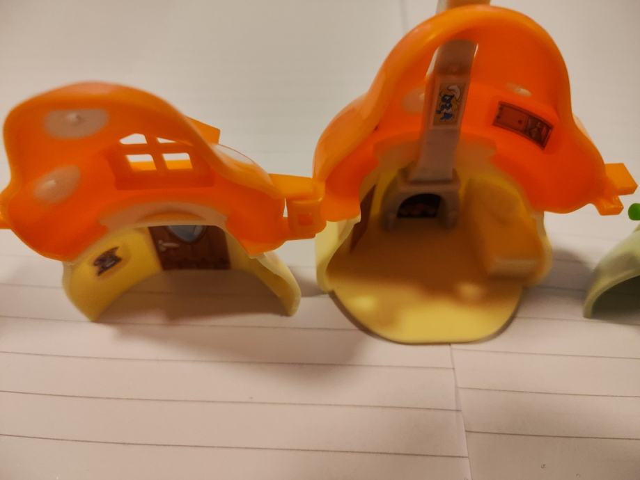 2 Štrumpf kućice izdubljene u narančastoj i zelenoj gljivi , otvaraju se tako da se vidi unutrašnjost, u kućici je kamin, i fotografija Štrumpfa i Štrumpfete.