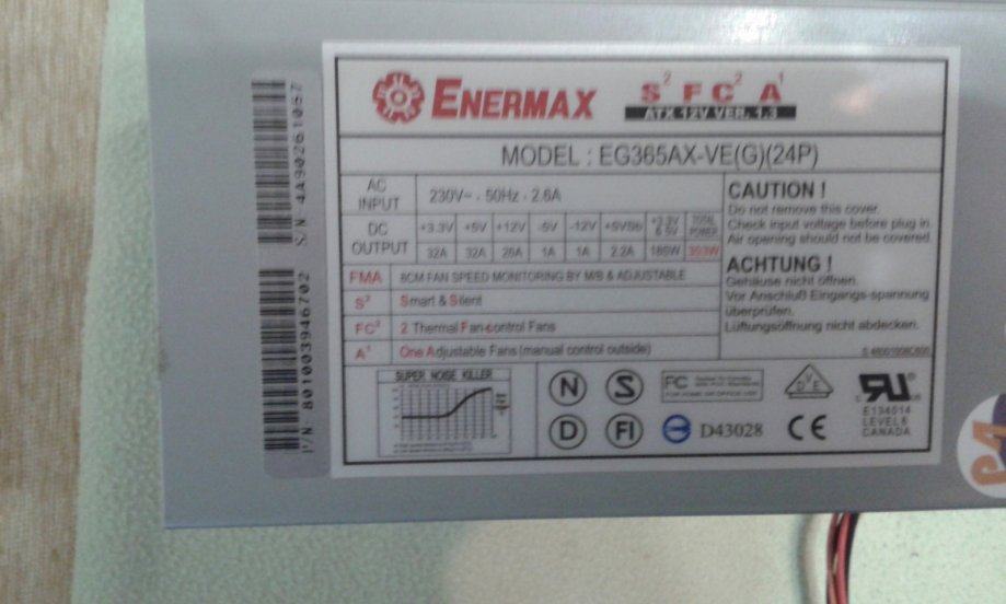 ENERMAX napajanje 355 wata,model 365AX-VE, vrlo tiho i stabilno sa potenciometrom,daje stvarnih 350 wata za razliku od "kineza"