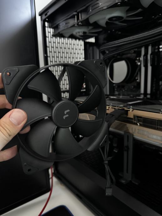 U kućištu su 3× 140 mm PWM ventilatora naprijed (tvornički Aspect 140 PWM), a poklanjam i 1× stražnji 140 mm ventilator.
