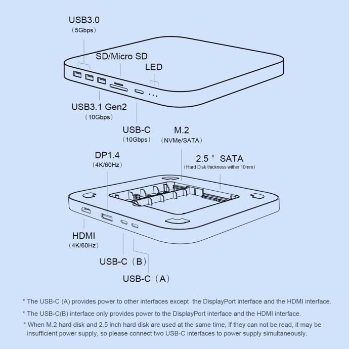 Kučište ima prostor za dva hard SSD diska - NVME M.2 i 2.5” SATA, USB, USB-C, SD/TF card.