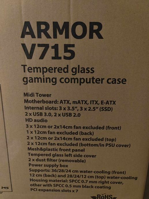 MS ARMOR V715 gaming kućište, ATX/mATX/ITX/E-ATX, unutarnji 3.5"x3, unutarnji 2.5"x3, USB 2.0 x2, USB 3.0 x2, sa filterom za prašinu, cable management 28mm, podržava vodeno hlađenje, dimenzije 415*215*480mm,