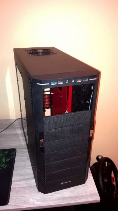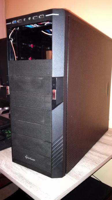 Kučište kupljeno rabljeno prije nekih 6 godina i bilo malo izgrebano došlo pa sam ga odlučio ''obući'' u karbonsku foliju onak iz zajebancije a tako je i ostalo. S vremenom na vrh kučišta ugrađen dodatni crveni led Corsair AF120 ventilator, na stražnjoj strani na ispuhu je Arctic Cooling F12 a naprijed 2 tvornička Sharkoon crveni led. Svi USB konektori rade kao i kablovi te utor za slušalice i mikrofon. Na slikama s prednje strane nema ona dva 5,25 poklopca ali spremljeni su, ništa ne fali od dodatne opreme koja je došla s kučištem.