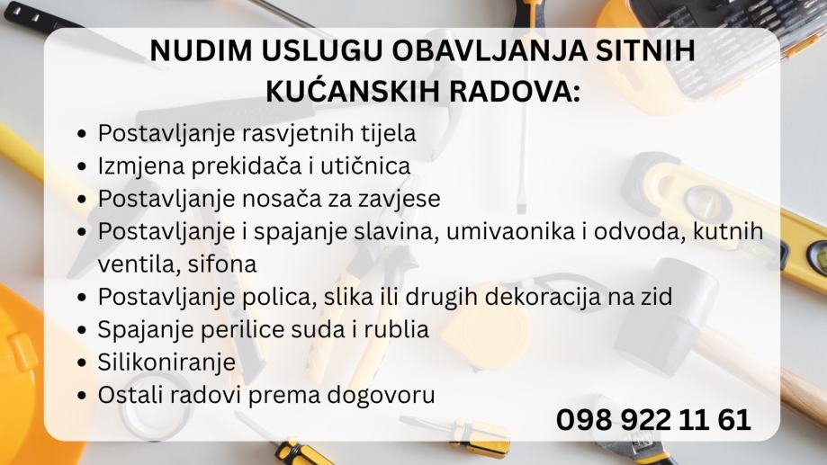 Nudim uslugu obavljanja manjih kućanskih i sitnih građevinskih radova - ako sami nemate iskustvo, vremena ili alat, tu sam za vas da vam pomognem!