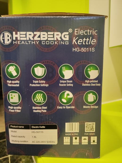 Herzberg električno kuhalo HG-5011S 1.8L dizajnirano je imajući na umu sigurnost i jednostavnost. Kuhalom za vodu upravlja se jednostavnim prekidačem za kuhanje/poništenje i sam će se poništiti nakon kuhanja. Kuhalo za vodu tada se može ukloniti iz 360 okretna baza za jednostavno izlijevanje. Sama baza je opremljena neklizajućim nožicama za sigurno prianjanje na vašu radnu površinu i ima prikladno spremište za kabel za napajanje. Kuhalo za vodu ima veliki kapacitet od 1,8 litara, osiguravajući dovoljno tople vode za do 8 šalica odjednom, a mjerač razine vode pokazuje koliko je kuhalo puno. Punjenje ne može biti lakše jer se poklopac kuhala za vodu može otvoriti jednom rukom pomoću gumba na vrhu ručke koji okreće poklopac u okomiti položaj. Za dodatnu sigurnost, značajka zaštite od kuhanja sprječava zagrijavanje kuhala za vodu ako nije napunjeno vodom. S elegantnom završnom obradom od brušenog čelika, može se koristiti u svakoj kuhinji.