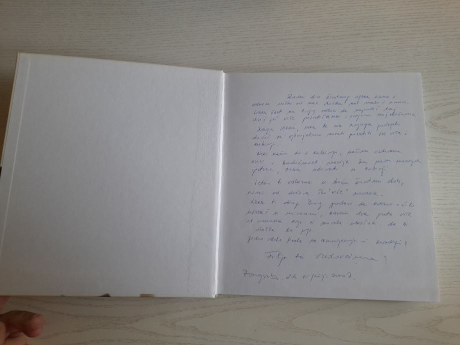 U odličnom stanju, ima minimalnih oštećenja na omotu knjige, ima veliku posvetu nekome na prvoj praznoj, bijeloj stranici, što je vidljivo na priloženim fotografijama.