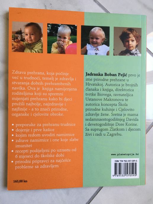 Prehrana djece velika je odgovornost – time svojoj djeci stvaramo prehrambene navike koje će ih pratiti cijeli život. Zdrava prehrana, koja počinje već u trudnoći, temelj je zdravlja pa je prirodno da svojoj djeci želite omogućiti najbolji mogući početak, a za to je potrebno znanje, nešto vještine i mnogo ljubavi. Knjiga je praktična i obiluje savjetima za rodilje i majke, maštovitim receptima i jelovnicima po godišnjim dobima, opisuje koje su namirnice važne u prehrani djece, a koje svakako treba izbjegavati. Jadranka Boban Pejić u ovoj knjizi donosi savjete za sve koji žele osigurati zdravlje svoje djece kroz kvalitetnu i cjelovitu prehranu.