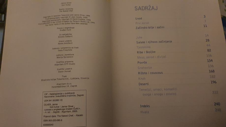 Prodajemo kuharicu poznatog engleskog kuhara Jamie Olivera pod originalnim nazivom ''Jamie Oliver: The Naked Chef'', izdana 2003. od izdavača Algoritam u Zagrebu. Knjiga je u jako dobrom stanju, sve su stranice na broju i jedva ima tragova korištenja. Skoro kao nova.