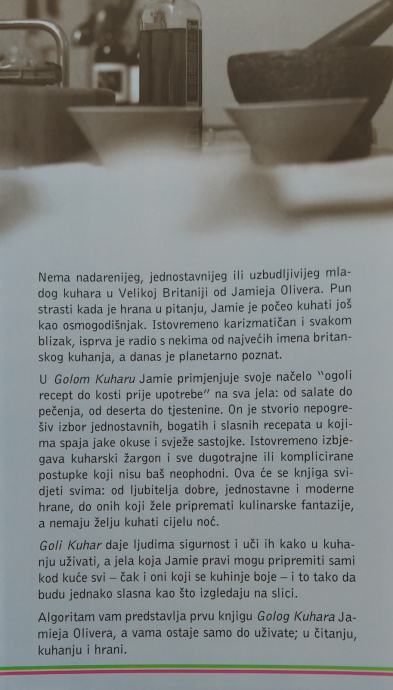 Prodajem knjigu, kuharica "Goli kuhar" autor Jamie Oliver, 250 stranica, profinjeni recepti, jednostavna i brza priprema. Knjiga je nova, nekorištena. Dimenzije: visina 25 cm, širina 19,5 cm. Cijena 15 eura.