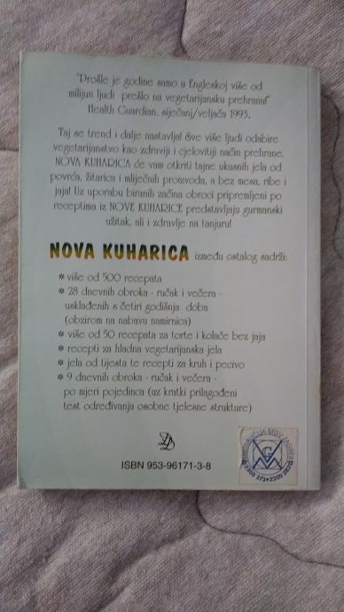 "Nova kuharica" nije obična knjiga vegetarijanskih recepata, iako donosi više od 500 recepata za jela od povrća, žitarica i mliječnih proizvoda. Knjiga nudi gotove jelovnike, kroz pojedina godišnja doba, za ručak i večeru, od juha do slastica, uvažavajući ritam prirode. Uz svaki jelovnik nalazi se i "mudrost dana", mudre izreke vezane uz jelo i načine pripremanja hrane. Sve namirnice potrebne za spravljanje predloženih obroka mogu se nabaviti u našim prodavaonicama.