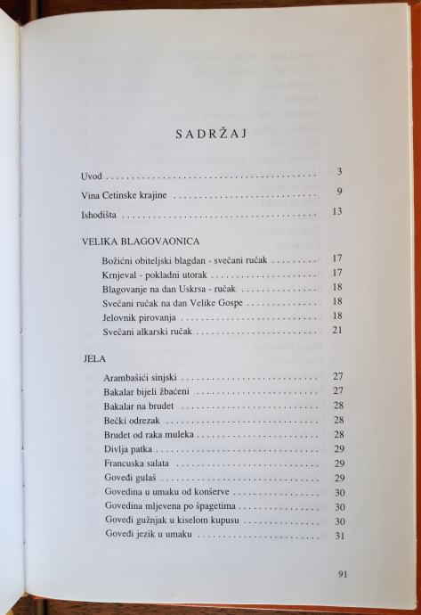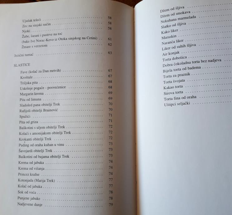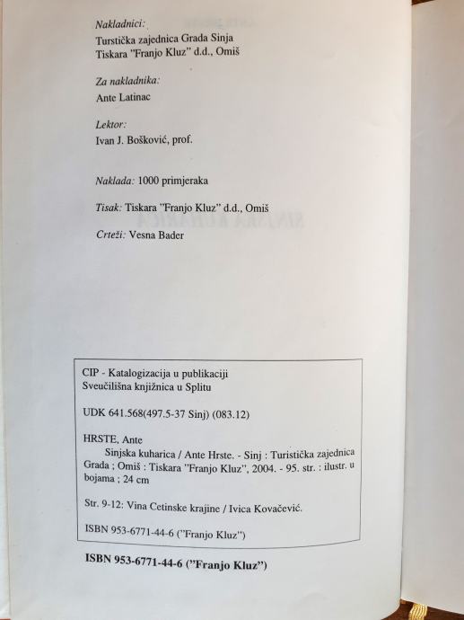 Od čuvenih *Sinjskih arambašića* do *Triljske pite*, *Rafijola obitelji Brainović* ili, recimo, *Baškotina od bajama obitelji Trek*, gastronomska povijest Cetinske krajine, njene najljepše delicije, redaju se pred vama „ka na pjatu“. Pa iako se i danas, kod spravljanja sinjskih specijaliteta, svi pozivaju na „Sinjsku kuharicu“ Ante Hrste, uzalud ćete je tražiti u prodaji. Oni koji je imaju ljubomorno je čuvaju, a ja se, eto, odričem ovoga primjerka, jer to sebi mogu priuštiti: prije nekoliko godina, naime, dobio sam sretno na poklon još jedan.