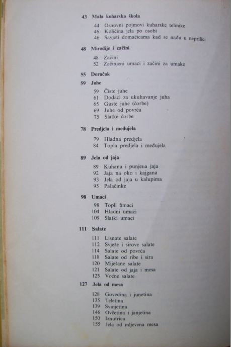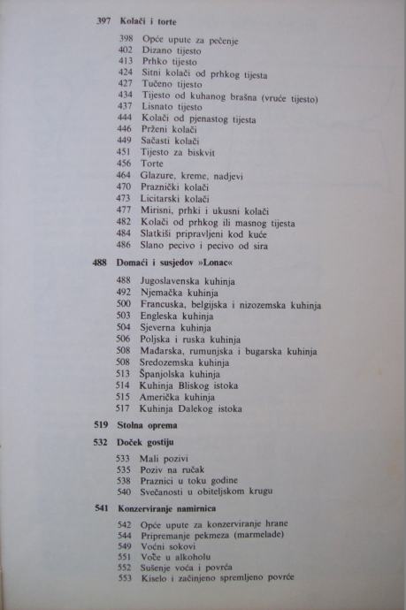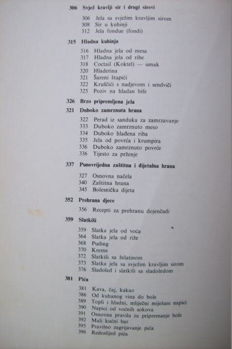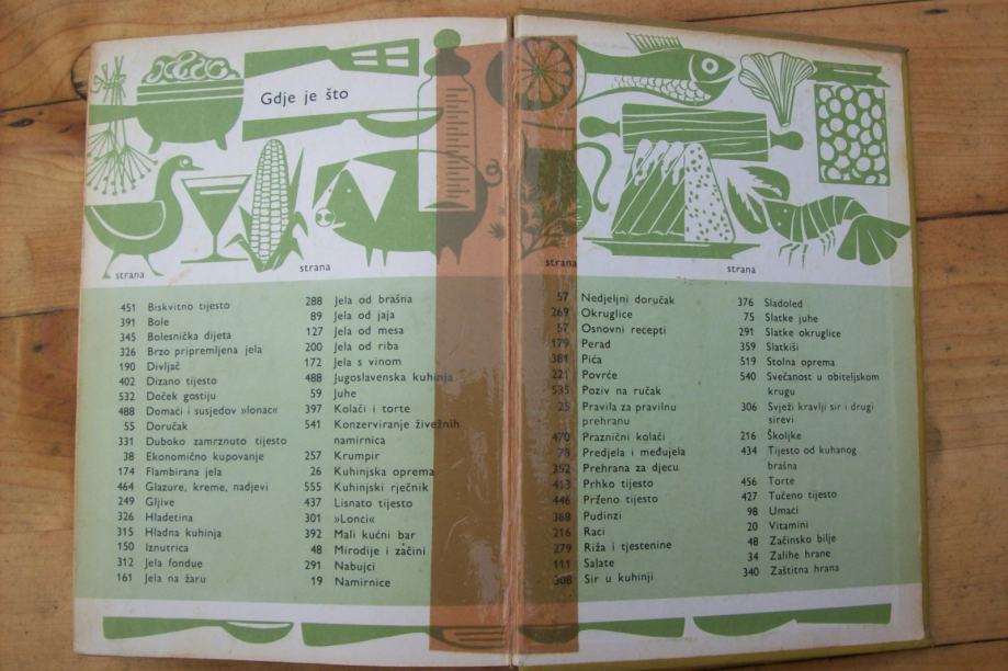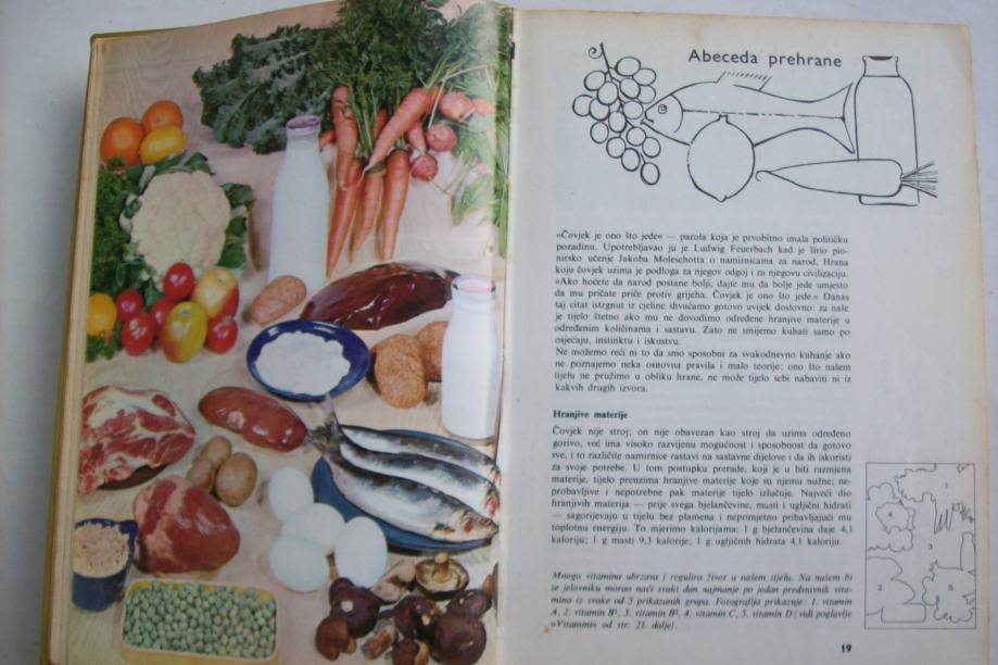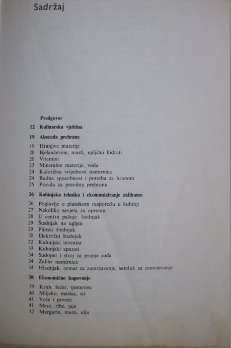 Abeceda prehrane, kuhinjska tehnika i ekonomiziranje zalihama, ekonomično kupovanje, mala kuharska škola, mirodije i začini, doručak, juhe, predjela i međujela, jela od jaja, umaci, salate, jela od mesa, jela na žaru, jela s vinom i lakoholnim pićima, perad, divljač, jela od riba, povrće, gljive, krompir, okruglice, riža i tjestenine, slatka jela od žitarica, sir, hladna kuhinja, duboko zamrznuta hrana, , prehrana djece, slatkiši, pića, kolači i torte, doček gostiju, konzerviranje namirnica…obilje savjeta, recepata, fotografija i ilustracija