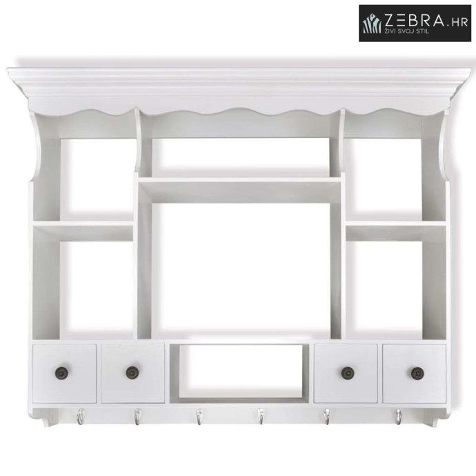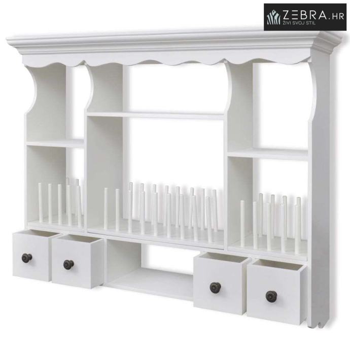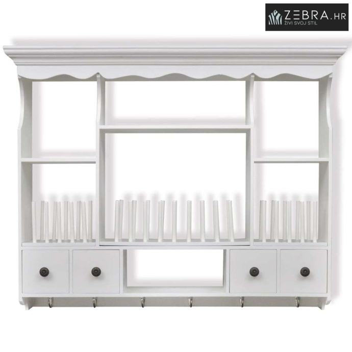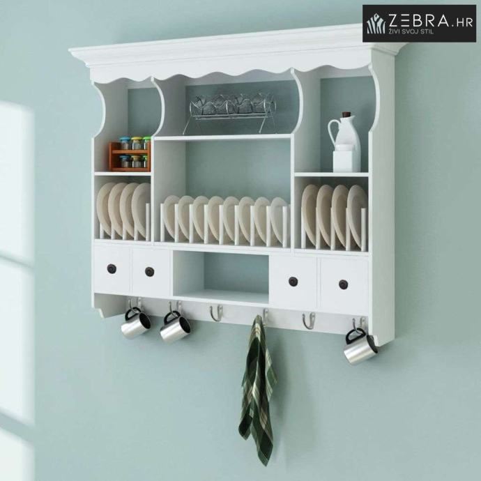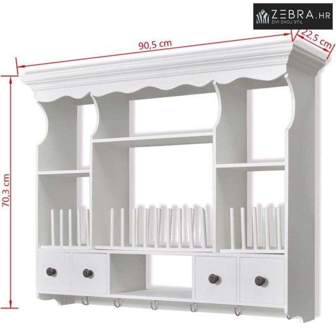 Ormarić ima četiri ladice i četiri police, što vam omogućuje jednostavno spremanje žitarica, začina, grickalica, konzerviranih proizvoda i još mnogo toga. Klinovi drže vaše tanjure i posuđe na mjestu. Ladice se lako otvaraju, tako da možete brzo uzeti stvari koje su vam potrebne. Opremljen je kukama za vješanje šalica ili ručnika.