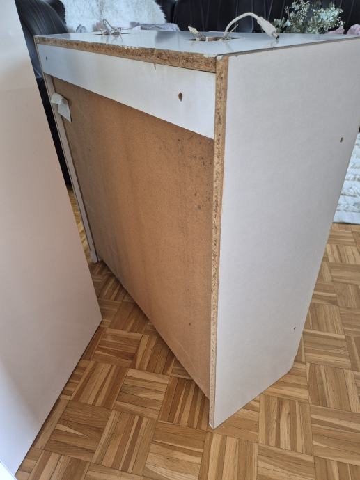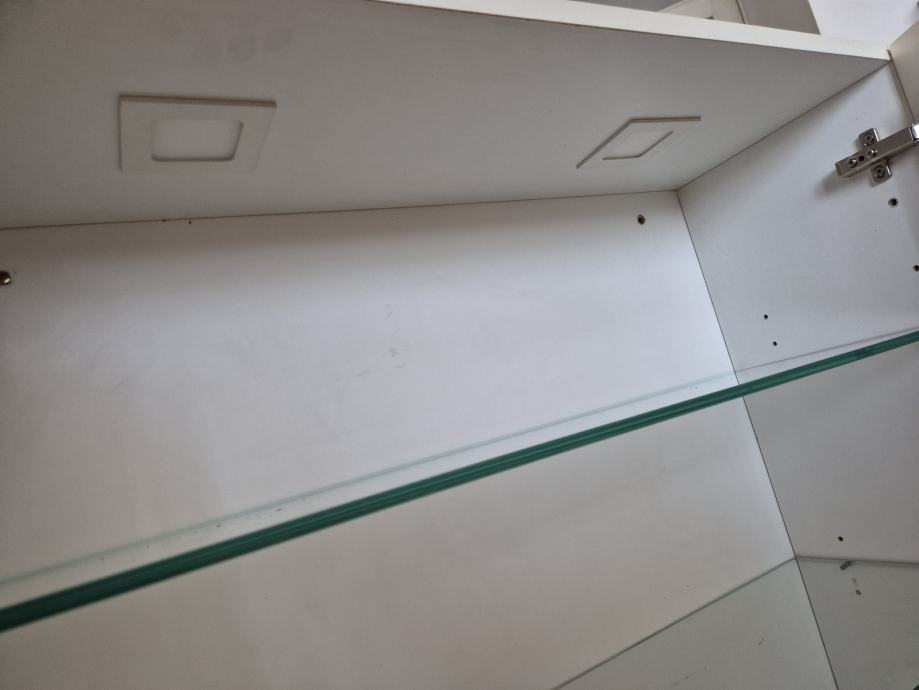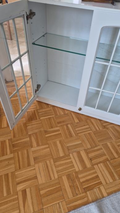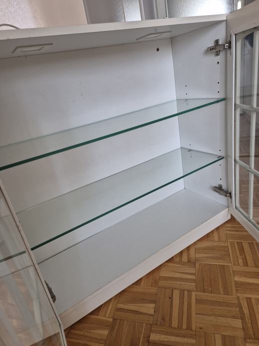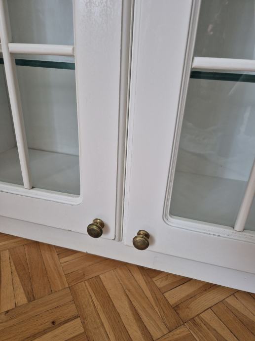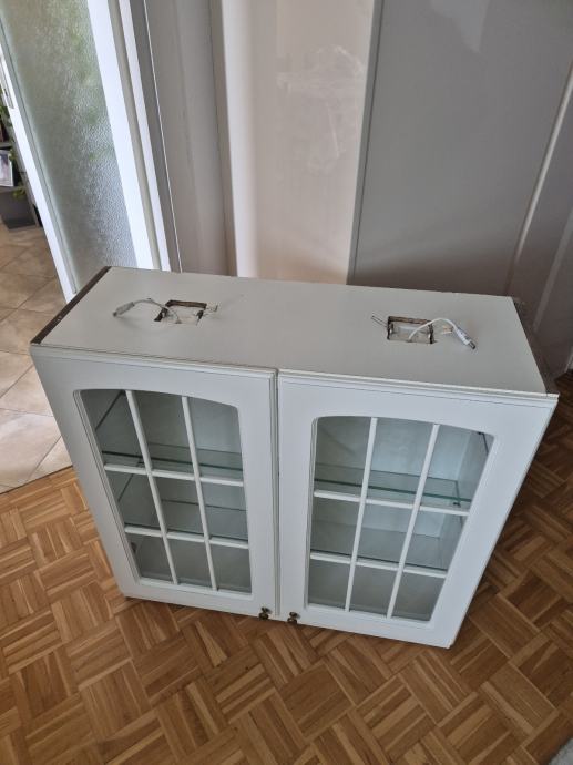 Prodajem drveni kuhinjski ormarić sa staklenim vratima, bijele boje. Ormarić ima dvoja vrata s karakterističnim lučnim okvirima i staklenim umetcima podijeljenim u mrežasti uzorak, te zlatne kvačice. Unutar ormarića nalaze se staklene police. Odgovara klasičnom, rustikalnom stilu kuhinje.