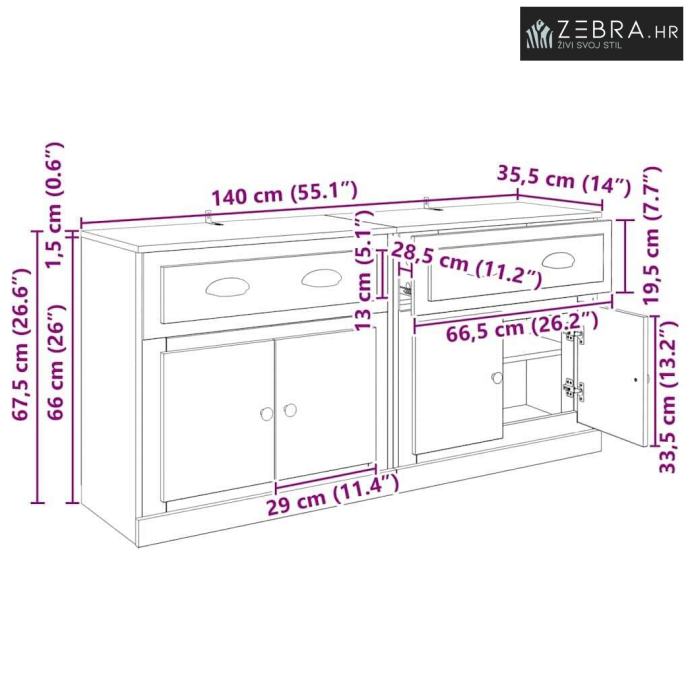 Izrađen od konstruiranog drva Ovo drvo je poznato po snazi i izdržljivosti, pa osigurava dugovječnost i čvrstoću. Izabrano je zbog otpornosti na savijanje i pucanje, savršeno za namještaj koji izdržava svakodnevnu upotrebu i zadržava izgled. Uključene police od daske Sideboard dolazi s policama od daske koje nude praktična rješenja za pohranu. Svaka polica pruža stabilnu podršku, idealna za teže predmete, održavajući pristupačnost i organizaciju. Moderni mat finiš Mat finiš dodaje eleganciju i suptilnost, čineći ga vizualno privlačnim za razne dekoracije. Nereflektirajuća površina zahtijeva minimalno održavanje i čuva estetski dojam. Funkcionalna vrata s šarkama Vrata s šarkama olakšavaju pristup skladišnim odjeljcima, maksimizirajući korištenje prostora. Metalne ručke su praktične i dodaju moderan dodir. Sveobuhvatne smjernice za njegu Ovaj sideboard je jednostavan za održavanje. Slijedite upute proizvođača za sastavljanje i redovito čistite izbjegavajući abrazivne materijale kako biste produljili njegovu trajnost i očuvali estetski izgled. Boja: Crni hrast
