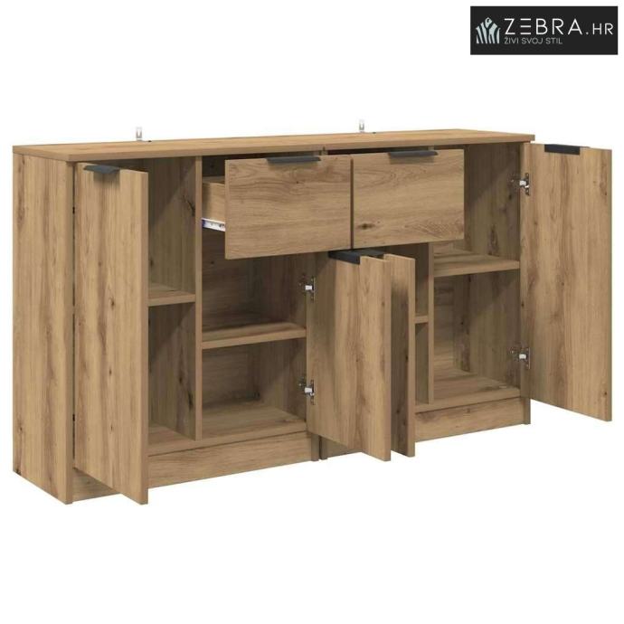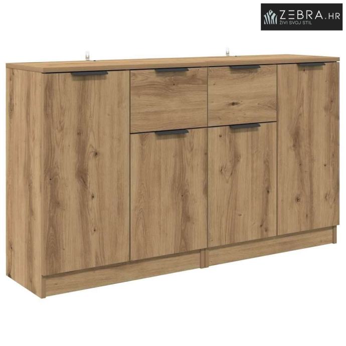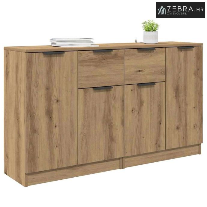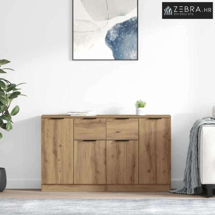 Kvalitetni materijali: Napravljena od inženjerskog drva, komoda je glatka, izdržljiva i otporna na izobličenja, pružajući pouzdano mjesto za pohranu koje izdrži svakodnevnu upotrebu. Funkcionalne police i ladice: Opremljena policama, ladicama i vratima, nudi fantastične mogućnosti za pohranu. Ovi dijelovi osiguravaju efikasno skladištenje posuđa i drugih važnih stvari, lako dostupnih uz jednostavno rukovanje. Elegantni moderni dizajn: Ova komoda, sa svojim jednostavnim i funkcionalnim stilom, savršeno se uklapa u svaku blagovaonicu ili kuhinju. Njene glatke linije i minimalna ukrasnost čine je svestranom opcijom za svaki dom. Sigurno i jednostavno održavanje: Minimalno održavanje je potrebno; dovoljno je brisati je suhom krpom. Izbjegavajte jake kemikalije kako biste sačuvali njen izgled. Također, preporučuje se pričvrstiti komodu za zid kako bi se spriječilo prevrtanje. Sveobuhvatno rješenje: Prodaje se u setu od dva, ova komoda nudi puno prostora za pohranu u kompaktnom dizajnu, idealnom za manje i veće prostore. S lakoćom se sklopi uz dvoje ljudi i nekoliko jednostavnih alata poput odvijača, omogućavajući poboljšanje skladištenja u vašem domu. Boja: Umjetnički hrast
