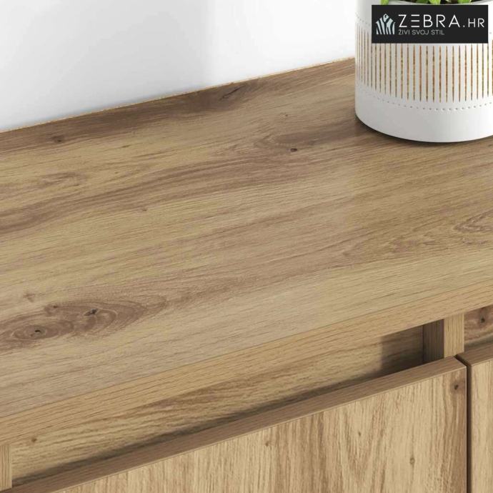 Kvaliteta materijala Ova vitrina je napravljena od konstruiranog drva, što joj daje dugotrajnost i lijepu teksturu. Spoj funkcionalnosti i estetike čini je odličnim izborom za svaku modernu kuću. Pohrana koja štedi prostor S policama od daske, vitrina efikasno smješta razne kućanske predmete, olakšava pristup i održava prostor urednim. Savršena je za manje sobe. Stilski dizajn Moderni, minimalistički izgled dodaje eleganciju bez preopterećivanja vašeg prostora. Vizualna simetrija čini ovu vitrinu izvanrednim dodatkom. Upotrebljivost i funkcionalnost Jednostavna je za korištenje i sastavljanje, a jasne upute pomažu u brzom postavljanju. Smjernice za održavanje Očistite je suhom krpom i izbjegavajte jake kemikalije. Osigurajte je za zid da biste spriječili prevrtanje. Boja: Umjetnički hrast