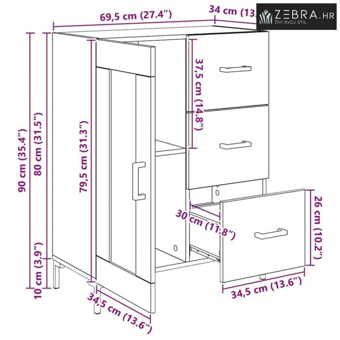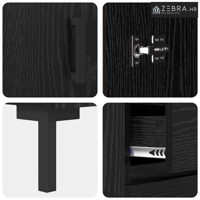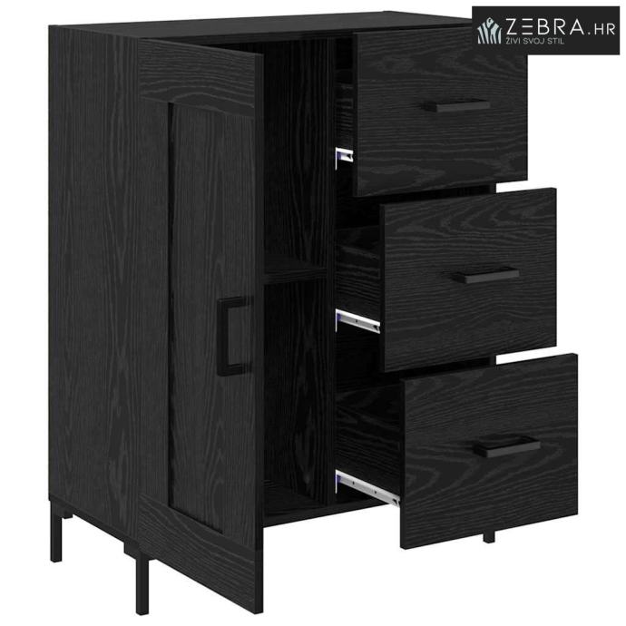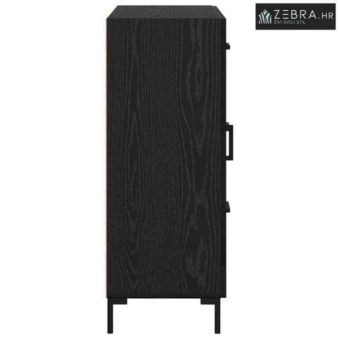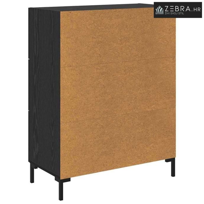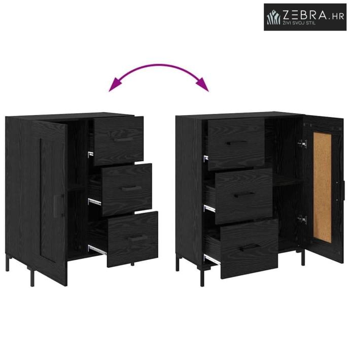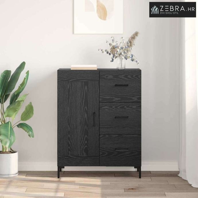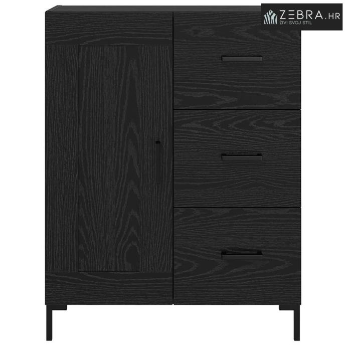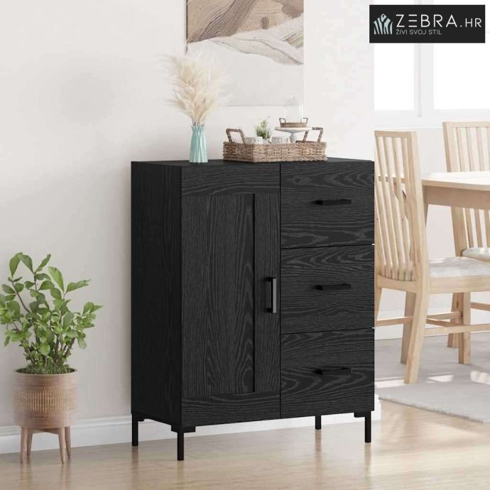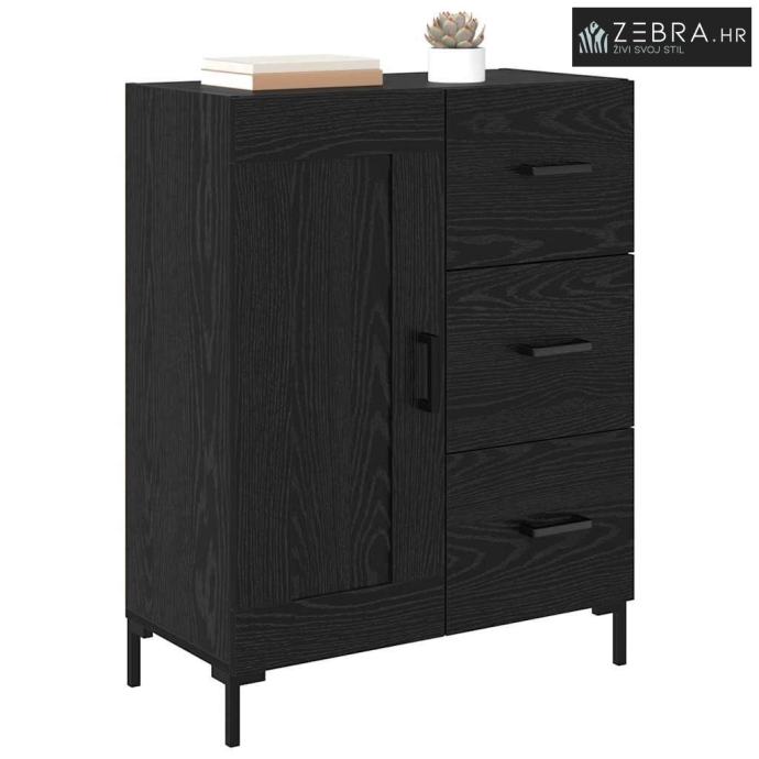 Izrađena od konstruiranog drva Ova komoda je napravljena od konstruiranog drva, poznatog po svojoj izdržljivosti i otpornosti na mrlje. Savršena za intenzivnu upotrebu, lako se održava s vlažnom krpom, zadržava izgleda svježe godinama. Funkcionalne komponente Ima vrtna vrata koja otvaraju prostrane dijelove za pohranu, police za lakšu organizaciju i ladice od konstruiranog drva za dodatnu pohranu. Čvrste željezne noge daju potporu za teške stvari, omogućujući upotrebu u stambenim i prometnim prostorima. Suvremeni stil Dizajnirana da se uklopi u moderan interijer, izgleda elegantno i svježe, idealna za minimalističke prostore. Ispunjava moderne estetske norme dok dodaje sofisticiranost prostoriji. Prostrano skladištenje Dimenzije 69,5 x 34 x 90 cm daju značajan prostor bez zauzimanja previše mjesta. Ispunjava razne potrebe za pohranom i optimizira prostor u sobama. Jednostavno održavanje Lako se čisti, treba samo malo brisanja s vlažnom krpom, zadržava svoj izgled i omogućava rutinsko održavanje. Ova praktičnost čini je nezaobilaznim dijelom vašeg doma na duži rok. Boja: Crni hrast