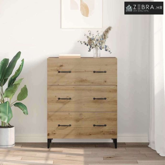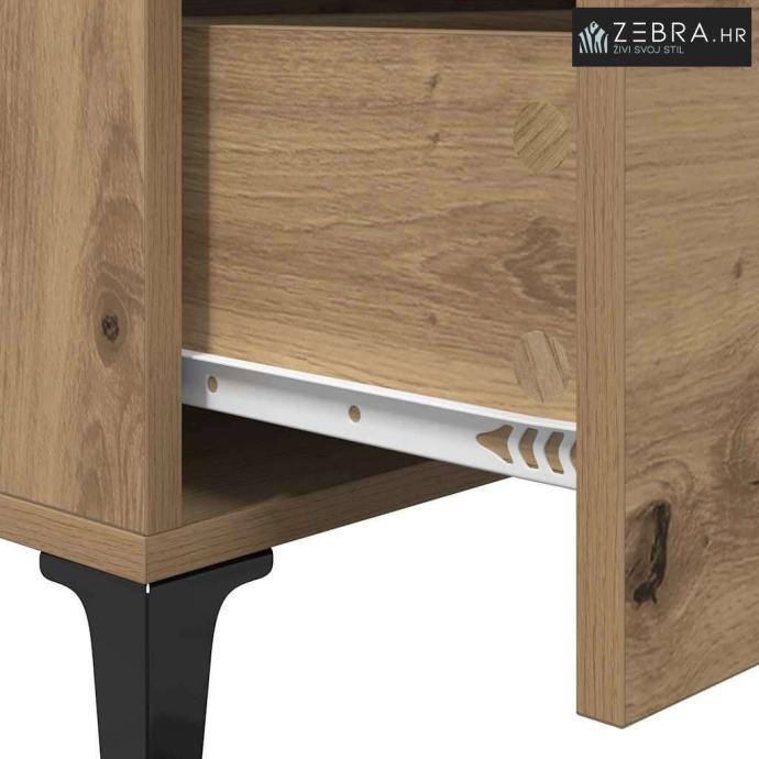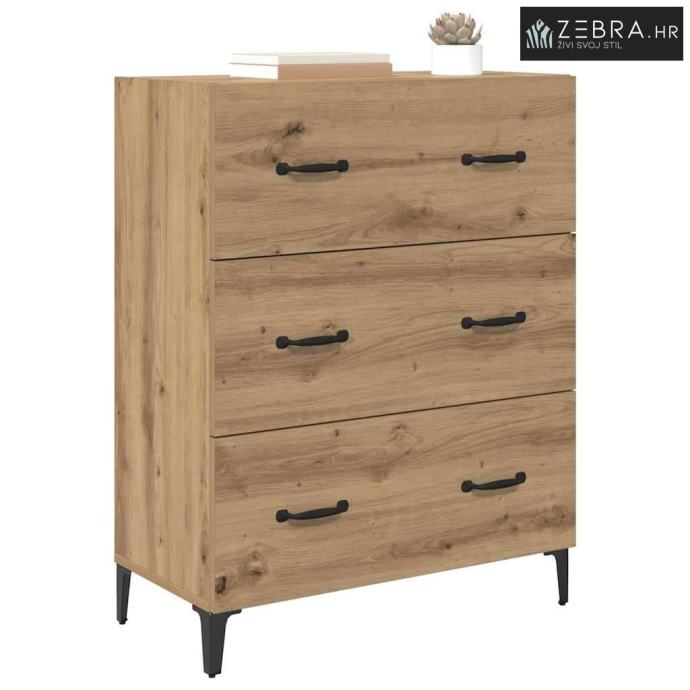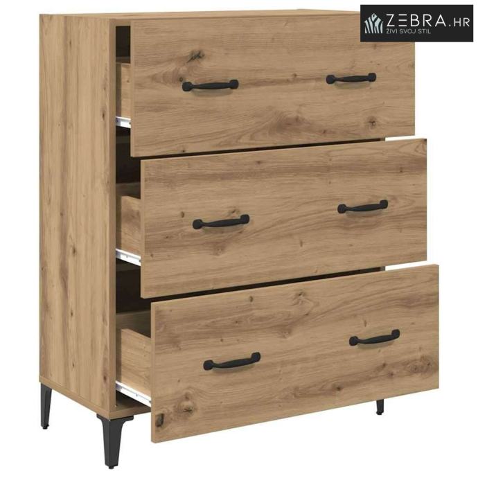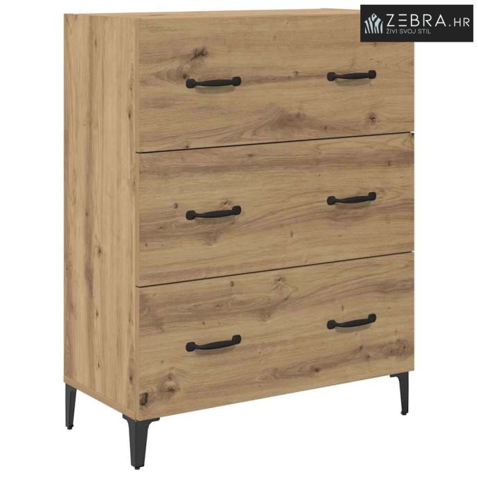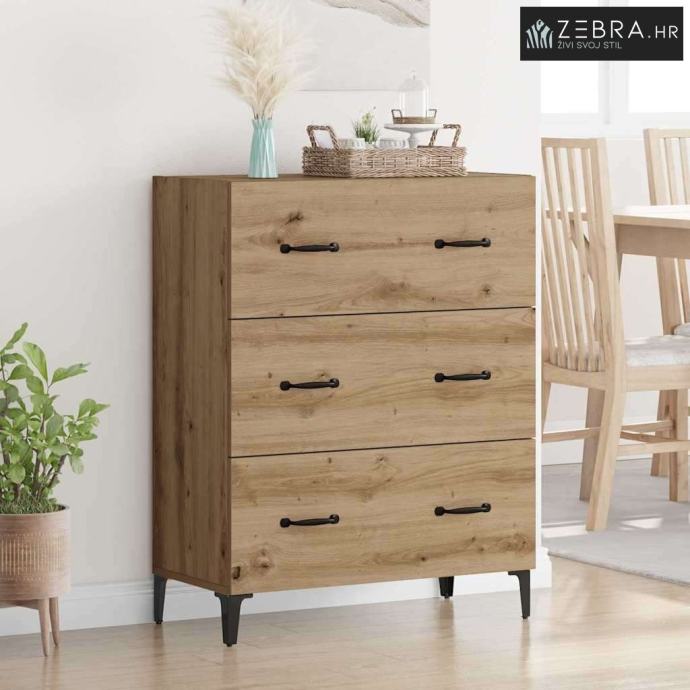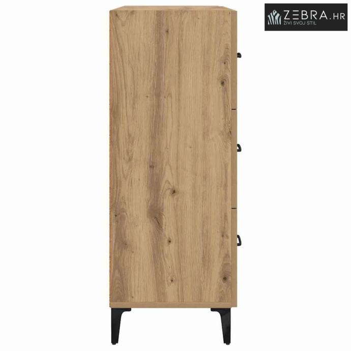 Konstruirani materijal: Ova komoda je napravljena od čvrstog konstruiranog drva koje ne deformira lako, što je čini dugotrajnim dodatkom vašem domu. Izgleda dobro, a istovremeno je i veoma izdržljiva, što osigurava da će zadovoljiti razne kućne potrebe. Željezne noge: Čvrste željezne noge osiguravaju stabilnost i podršku. Crne noge u obliku strijele dopunjuju rustikalni izgled i omogućuju lako čišćenje. Ova sitnica pomaže da se komoda uklapa u razne tipove poda. Mat ručke: Crne mat ručke dodaju sofisticiranost bez preopterećenja rustikalnog stila komode. Olakšavaju pristup unutrašnjosti, što je super za svakodnevnu upotrebu. Mat finish je otporan na otiske prstiju, što doprinosi čistom izgledu. Obilno skladištenje: S brojnim pregradama i ladicama s kugličnim ležajevima, ova komoda nudi odličan kapacitet za skladištenje. Savršena je za organizaciju svih vrsta stvari – od posuđa do osobnih kolekcija, držeći prostor urednim i privlačnim. Lako čišćenje: Površina od konstruiranog drva se lako čisti – samo je obrišite vlažnom krpom da zadrži svoj sjaj. Tako će vaš dom izgledati sjajno godinama. Boja: Umjetnički hrast