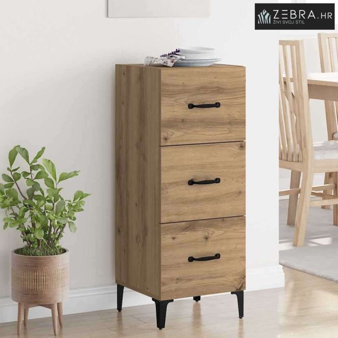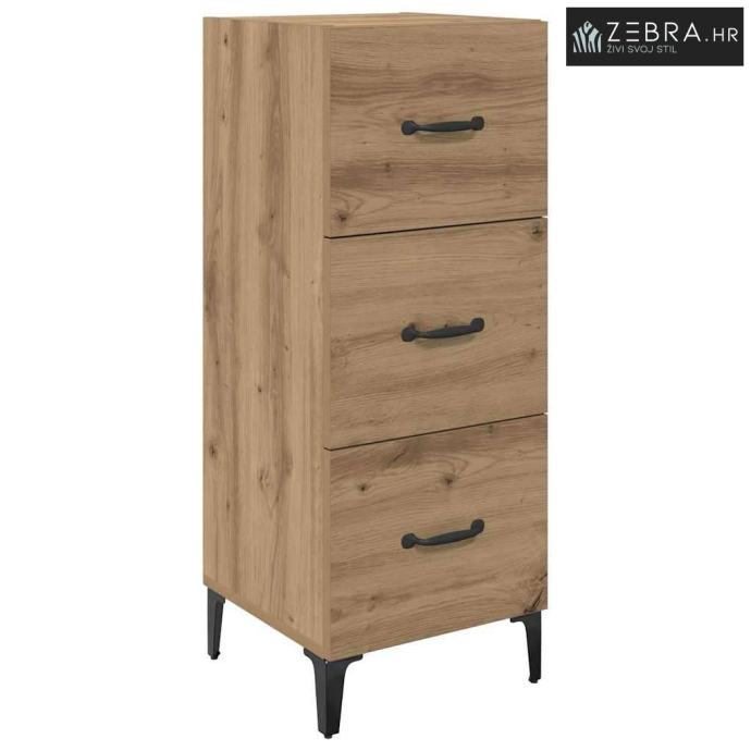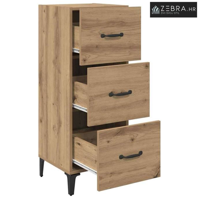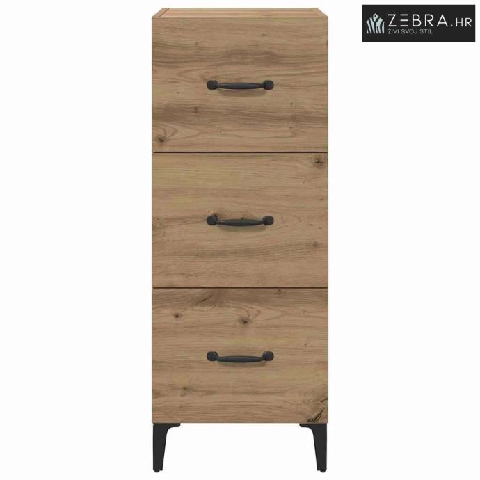 Izdržljivi materijali: Ova komoda je napravljena od konstruiranog drva, koje daje jak i dugotrajan okvir za svakodnevnu upotrebu. Materijal stvara ravnotežu između prirodne ljepote i čvrstoće, čineći da ostane pouzdana u vašem domu. Metalni dijelovi: Ručke i noge komode su od robusnog metala, koji se odlično uklapa s bojama konstruiranog drva, a pruža dodatnu stabilnost. Ovaj pametan izbor osigurava dugovječnost komode, tako da će vas služiti godinama. Glatka tekstura dodaje malo sofisticiranosti. Obilni prostori za pohranu: Sa prostranim odjeljcima i ladicama koje se lako otvaraju, organizacija vaših stvari postaje jednostavna. Ladice se lako koriste, omogućujući brz pristup svojim stvarima. Ovaj raspored je pažljivo osmišljen kako bi zadovoljio razne potrebe za pohranom uz dozu elegancije. Funkcionalan dizajn: Ova komoda je spoj funkcionalnosti i stila, s D-ručkom koja olakšava korištenje. Ova značajka dodaje praktičnost, olakšavajući pristup sadržaju, poboljšavajući vaša rješenja za pohranu i unapređujući karakter vašeg doma. Laka njega: Samo obrišite ovu komodu vlažnom krpom kako biste zadržali njen sjaj. Ova jednostavna uputa za njegu osigurava da će komoda zadržati svoj šarm i integritet tijekom dugotrajne upotrebe, bez dodatnog truda s vaše strane. Boja: Umjetnički hrast