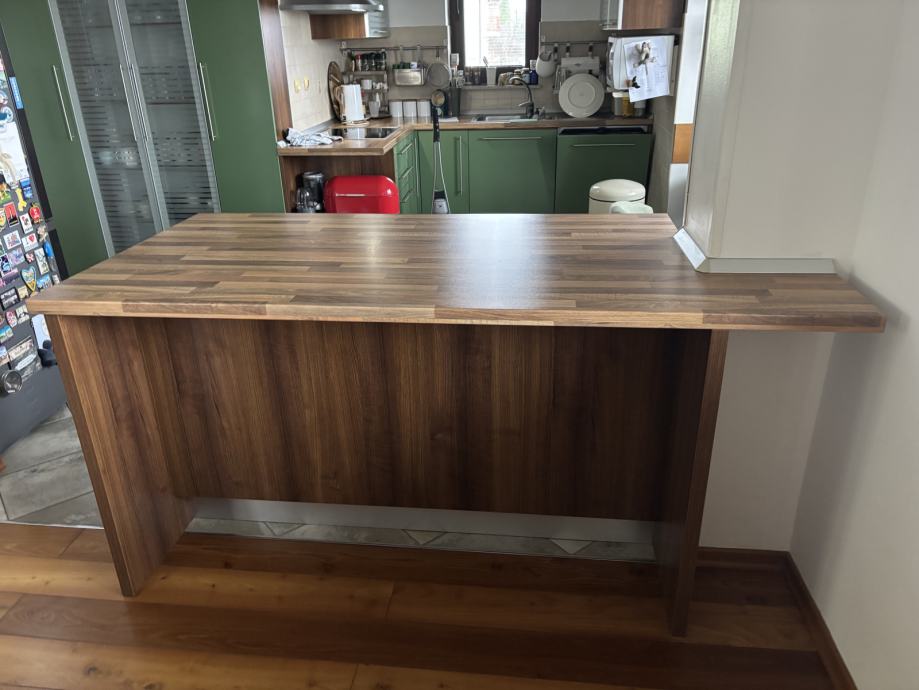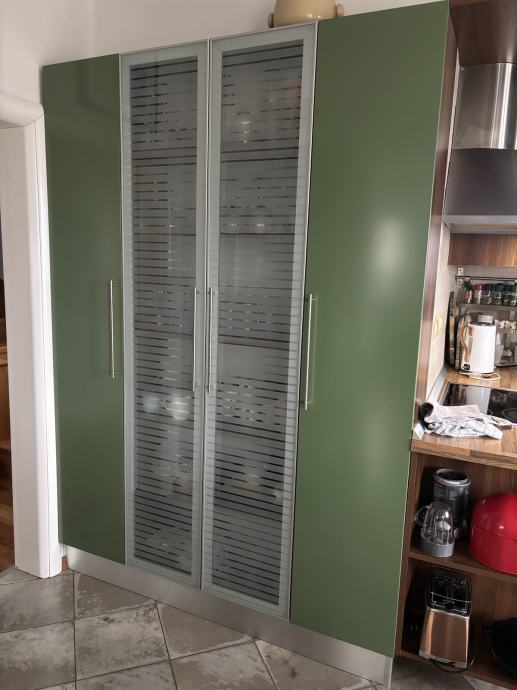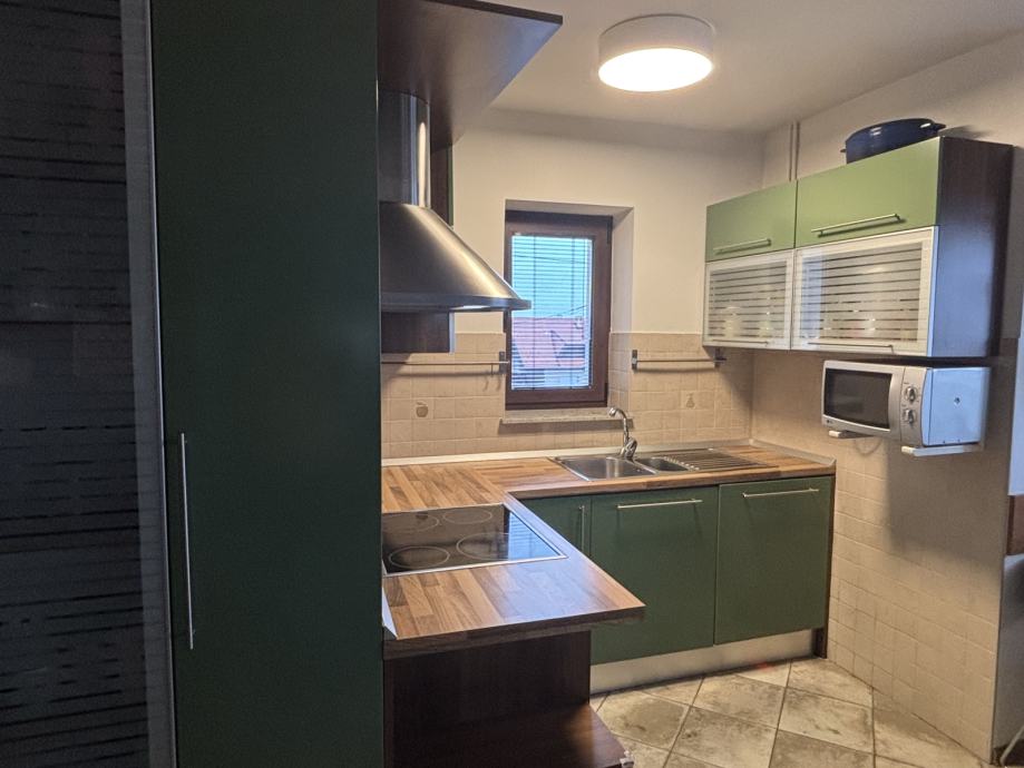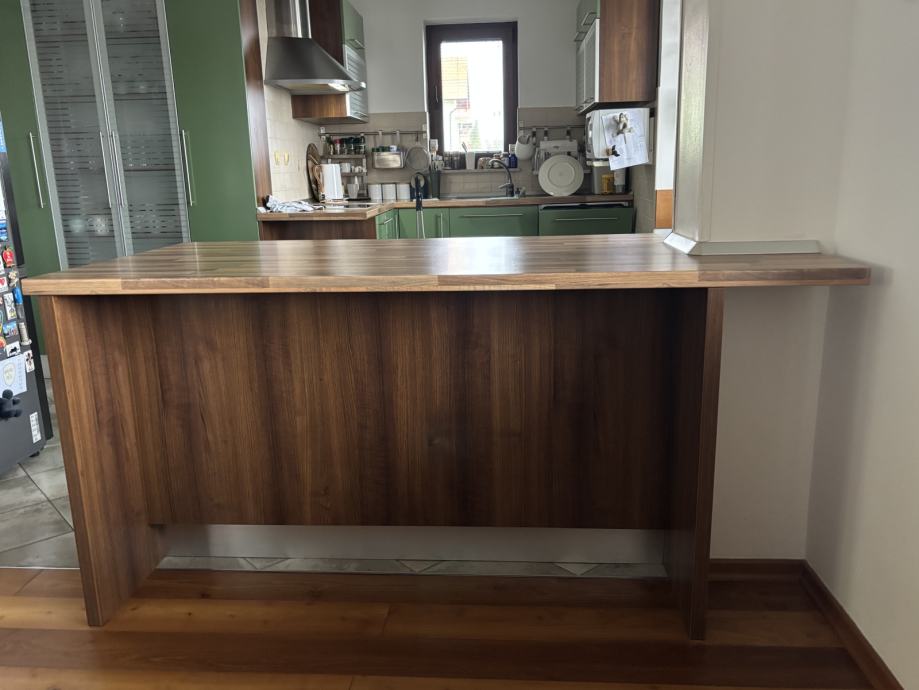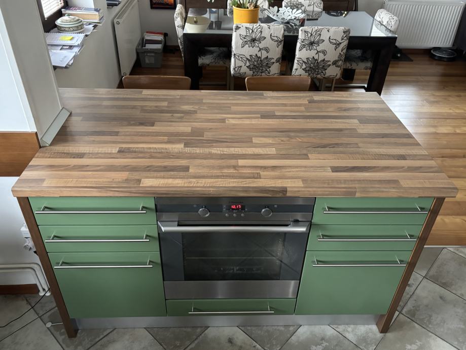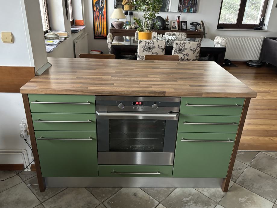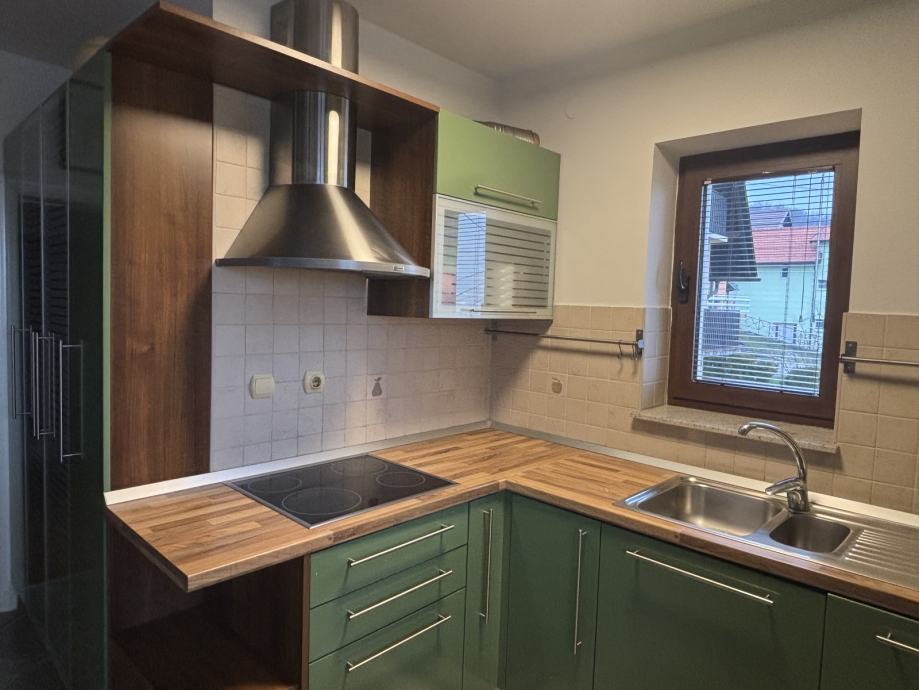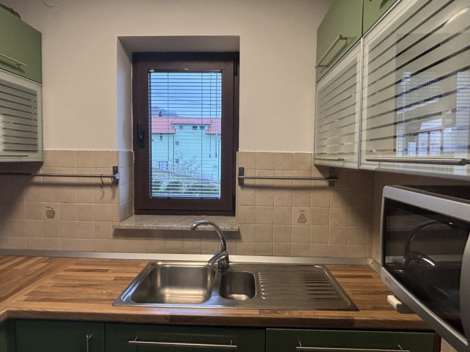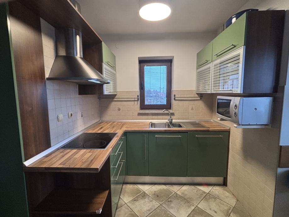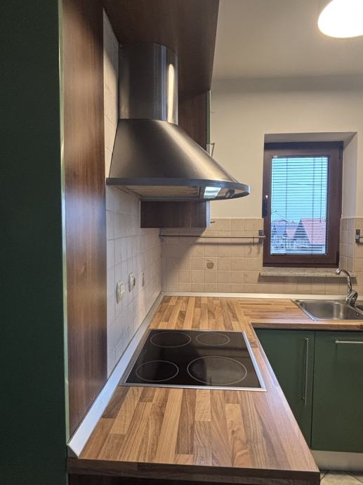 Kuhinja sa svim elementima, regalom, stol i stolice, otok i svi aparati ploča za kuhanje, napa, pečnica, sudoper, slavina, BEZ perilice posuða.