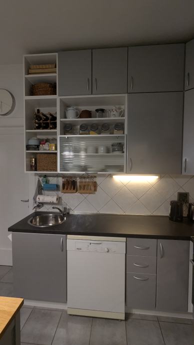 Prodajem kuhinjske elemente zajedno s aparatima. Kuhinja je sive boje s tamnom radnom pločom i sastoji se od gornjih i donjih ormarića, uključujući otvorene police. U cijenu su uključeni ugradbena plinska ploča za kuhanje, napa, sudoper te perilica posuđa. Uz to dolazi i Whirlpool mikrovalna pećnica. Svi uređaji su u funkciji. Pećnica i frižider nisu na prodaju.