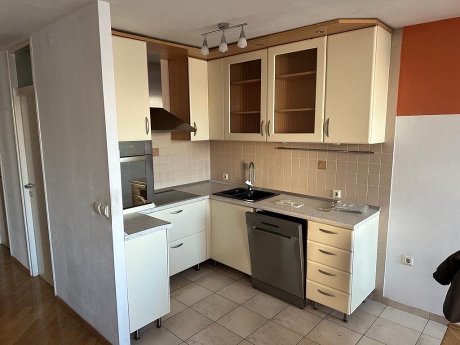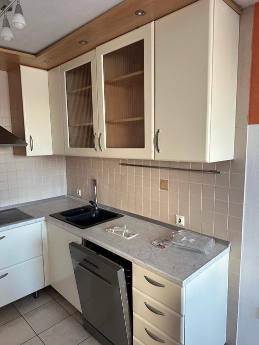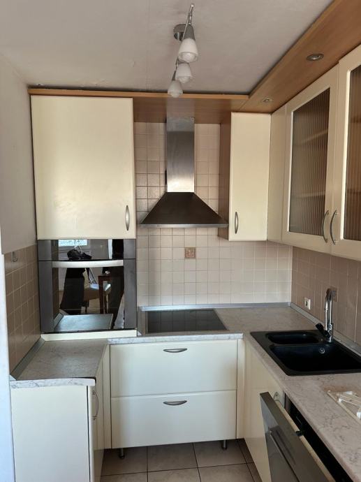 Prodajem dobro očuvanu kuhinju krem boje. Kuhinja se sastoji od 5 gornjih elemenata i 4 donja. Gornji elementi: 2 zatvorena s policama, 2 staklena s policama, jedan kutni. Donji elementi: 2 kutna, jedan široki s ladicama, jedan uži s ladicama. Dimenzije su 190cm x 220cm, dubina 60cm. Uz kuhinju se prodaju pećnica, napa i radna ploča (uključeno u cijenu). Suđerica nije na prodaju. Demontažu i odvoz odrađuje kupac.