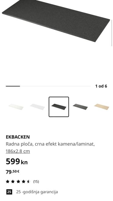 Prodajem kuhinjsku radnu ploču IKEA Ekbacken, malo oštećenu u pola cijene. Dimenzije 186x2.8cm. Boja crna efekt kamena/laminat. Ploča je nova i nekorištena. Na slici je prikazano oštećenje.