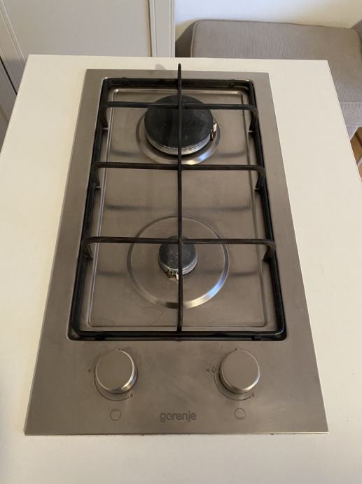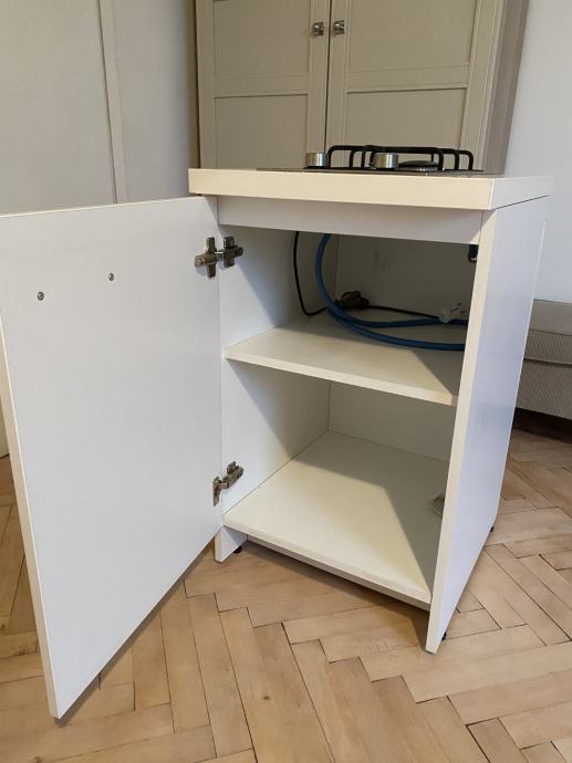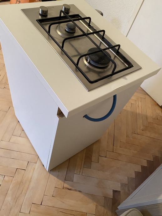 Kuhinjski element bijele boje u odličnom stanju s Gorenje inox pločom koja sadrži dva kuhala na plin te crijevo i regulator.