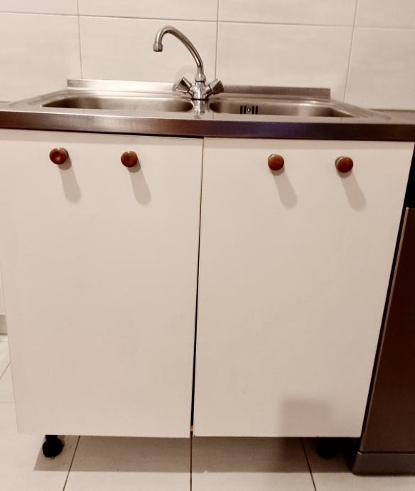 Kuhinjski element (dimenzija širina 80cm, dubina 61cm, visina podesiva) s ugrađenim dvostrukim sudoperom i zaokretnim vratima.