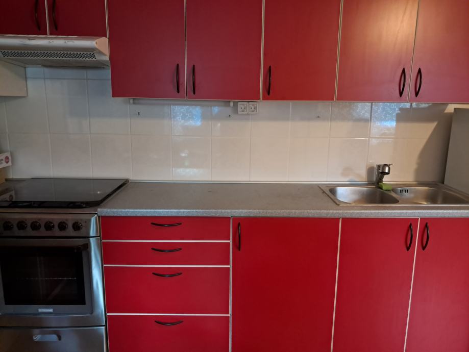 Kuhinjski elementi kao na slici, drveni dio i sudoper s pipom. Čisti, neoštećeni, vrlo malo korišteni. Ukupna dužina donjih ormarića 200 cm, gornjih 260cm. Ormarić iznad sudopera je ocjeđivač za posuđe. Osim ovih na slici još su dva viseća ormarića širine 80cm svaki, te otvorena polica širine 55cm.