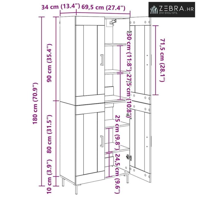 Sveukupne dimenzije: 69,5 x 34 x 180 cm (D x Š x V)