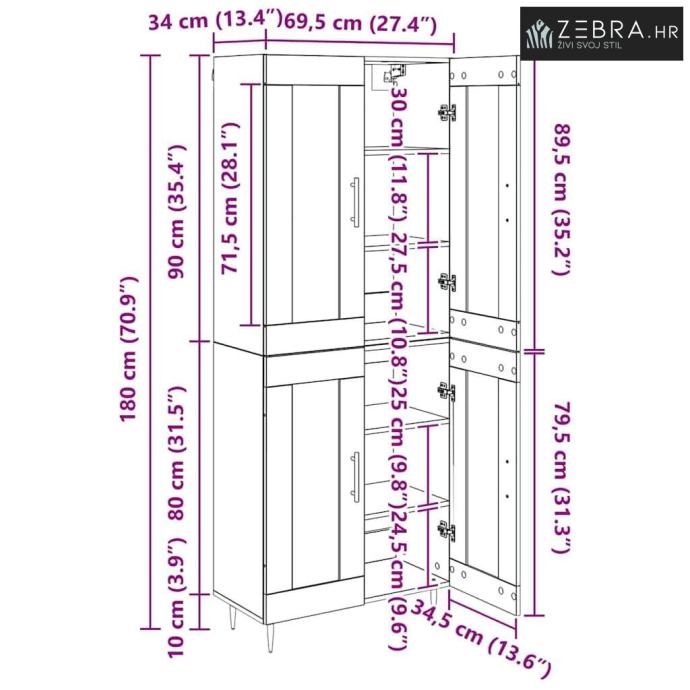 Sveukupne dimenzije: 69,5 x 34 x 180 cm (D x Š x V)