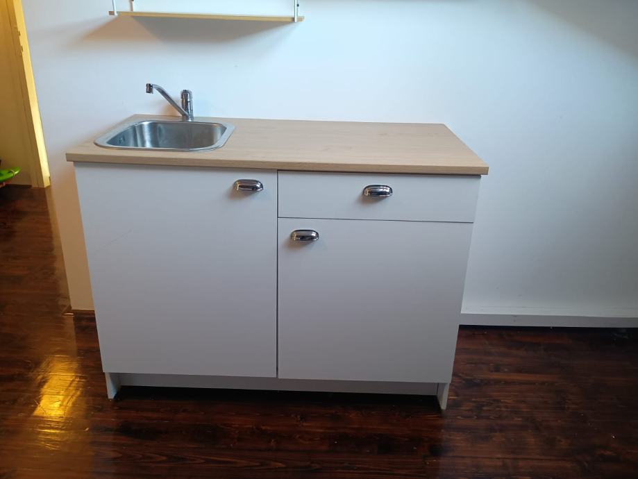 Kuhinjski ormarić sa sudoperom i slavinom.