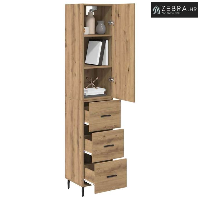 Izrađen od konstruiranog drva: Ovaj visoki ormarić je napravljen od kvalitetnog konstruiranog drva, poznatog po svojoj izdržljivosti i modernom izgledu. Osigurava dugotrajan proizvod koji podnosi svakodnevno korištenje. Glatka površina olakšava čišćenje i dodaje elegantan dojam svakoj prostoriji. Prostrani skladišni prostor: Ima više odjeljaka koji su savršeni za organizaciju blagovaonskog posuđa, knjiga ili ukrasa. Ove skladišne jedinice pomažu u smanjenju nereda, stvarajući uredno i mirno okruženje kod kuće. Metalne noge za stabilnost: Čvrste metalne noge pridonose modernom izgledu i osiguravaju stabilnost, držeći ormarić čvrsto. Njihova crna boja stvara lijep kontrast s drvenim tonovima, čineći prostor sofisticiranim. Moderni estetski: Jednostavan dizajn sa čistim linijama i minimalizmom, što ovaj ormarić čini prilagodljivim različitim enterijerima, od industrijskih do minimalističkih. Njega i održavanje: Jednostavno održavanje - obrišite suhom krpom i izbjegavajte jake kemikalije. Važno je pričvrstiti ormarić za zid da se spriječi prevrtanje, osiguravajući sigurnu upotrebu. Boja: Umjetnički hrast
