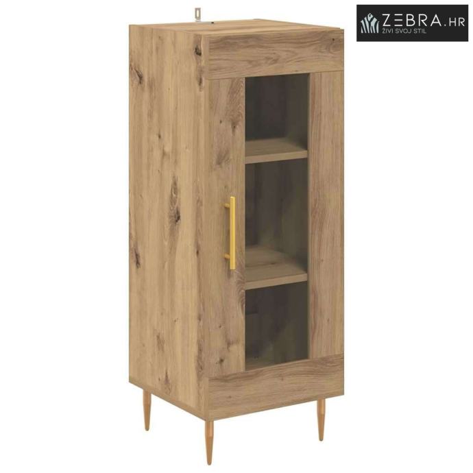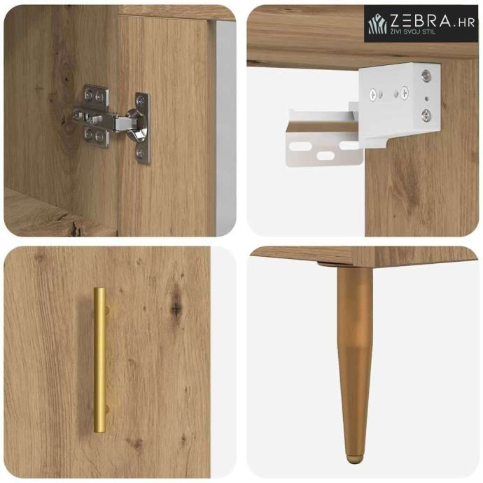 Konstrukcija od konstruiranog drva: Napravljen od visokokvalitetnog konstruiranog drva, ovaj bufet kombinira pouzdanost i privlačan izgled. Odlično se uklapa u moderne interijere, a materijal osigurava stabilnost i otpornost, podupirući dizajn za svakodnevnu upotrebu. Funkcionalne komponente: Ovaj bufet ima police za optimalno postavljanje pribora za jelo ili kolekcionarskih predmeta. Vrata sa šarkama omogućuju jednostavan pristup, dok stražnja strana od konstruiranog drva dodaje čvrstoću i osigurava da su tvoje stvari sigurne unutra. Moderne značajke: Elegantne zlatne ručke se ističu na crnim konusnim nogama, donoseći upečatljiv kontrast koji podiže modernu atmosferu. Olakšavaju otvaranje i zatvaranje vrata, dodatno poboljšavajući industrijski chic izgled. Svestrana upotreba: Ovaj bufet je dizajniran za unutarnju upotrebu i odgovara različitim prostorijama, od blagovaonica do dnevnih boravaka. Uklapa se u moderni stil, dodajući dašak elegancije dok nudi funkcionalan prostor za pohranu. Sigurnost i njega: Prati upute za sastavljanje i pričvrsti bufet za zid kako bi spriječio prevrtanje. Redovito čistiti brisanjem prašine i povremeno korištenjem meke, suhe krpe za održavanje sjaja. Boja: Umjetnički hrast