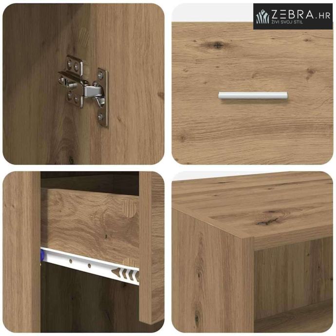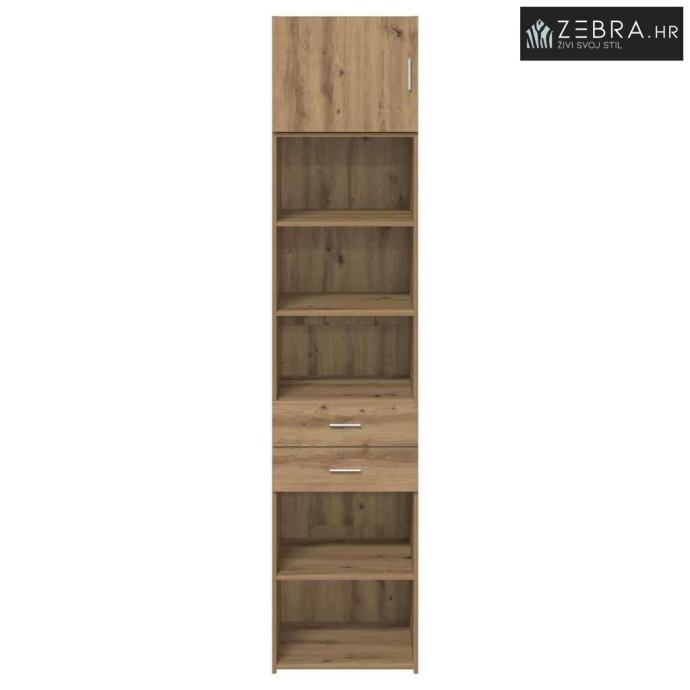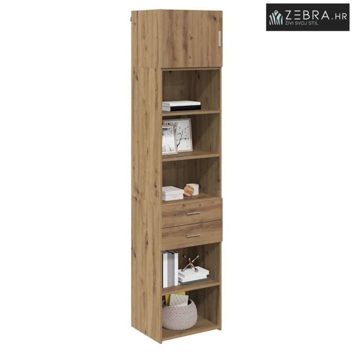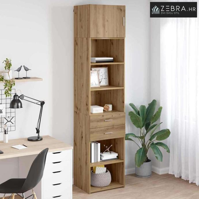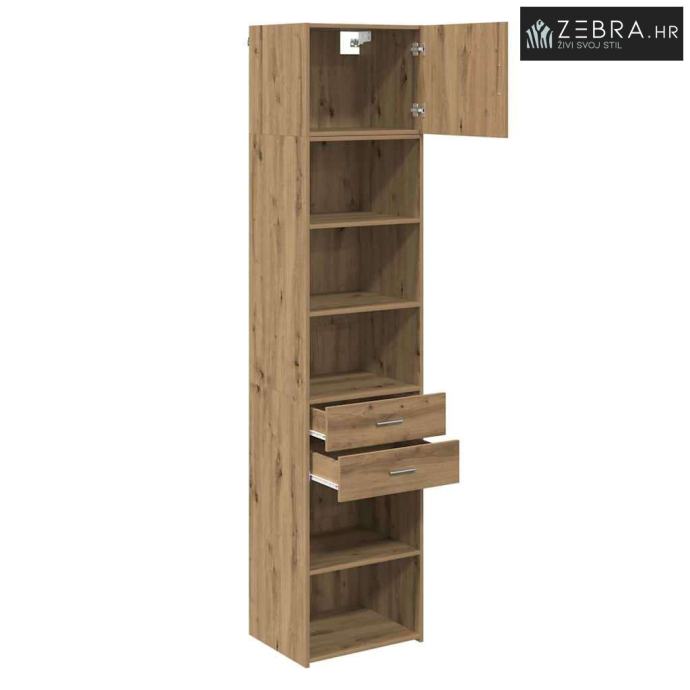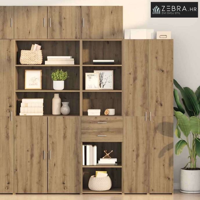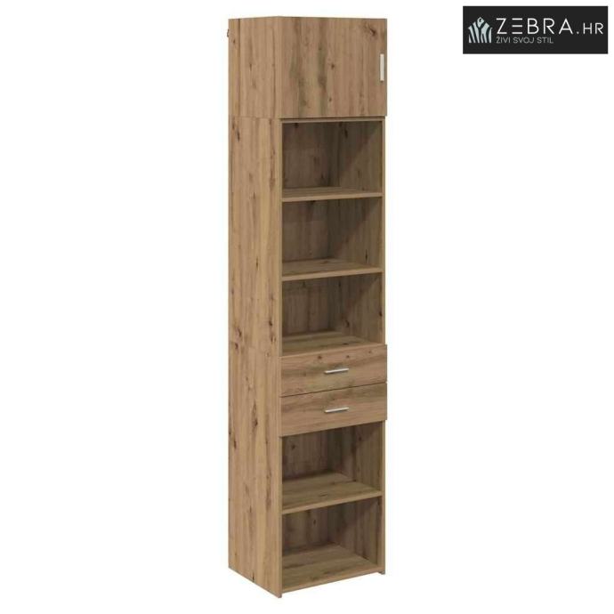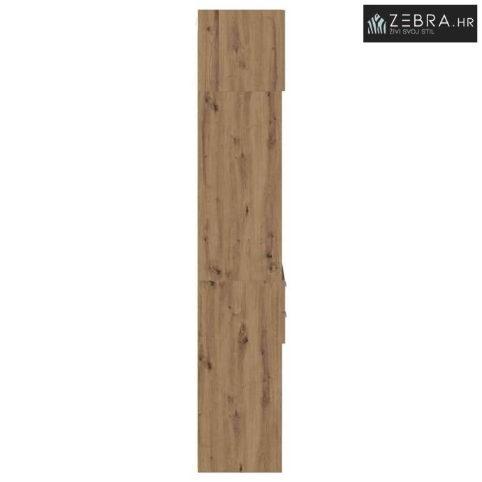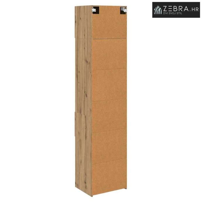 Izrada od konstruiranog drva Napravljen od konstruiranog drva, ormar jamči izdržljivost i stabilnost. Otporan je na toplinu, pa bez problema izdržava svakodnevnu upotrebu, a zadržava svoj elegantan izgled. Površina se lako čisti, pa je održavanje jednostavno. Višestruki dijelovi Ovo skladišno rješenje uključuje visoki ormar dimenzija 50 x 42,5 x 185 cm i dodatni zidni ormar dimenzija 50 x 42,5 x 40 cm. Zajedno nude puno prostora za pohranu. Police i odjeljci od konstruiranog drva pomažu u organizaciji vaših stvari, i u otvorenim i u skrivenim dijelovima. Funkcionalne karakteristike Zidna montaža ovog ormara omogućuje da maksimizirate prostor na podu bez smanjenja kapaciteta pohrane. S dvoje ljudi i odvijačem, sastavljanje je jednostavno. Obilje prostora za pohranu osigurava urednost i elegantan dizajn. Preporučena upotreba u dnevnoj sobi Ormar je dizajniran za unutarnju upotrebu i savršen je za dnevne boravke gdje je važno štedjeti prostor. Super je za organiziranje knjiga, dekoracija i dodatnih kućanskih potrepština, čime održava sve u redu. Održavanje Slijedite upute proizvođača prilikom sastavljanja i koristite potrebne alate. Redovno brišite površine suhom krpom, izbjegavajte oštre kemikalije kako biste očuvali ormar. Boja: Umjetnički hrast