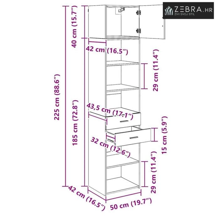 Sveukupne dimenzije: 50 x 42,5 x 225 cm (D x Š x V)