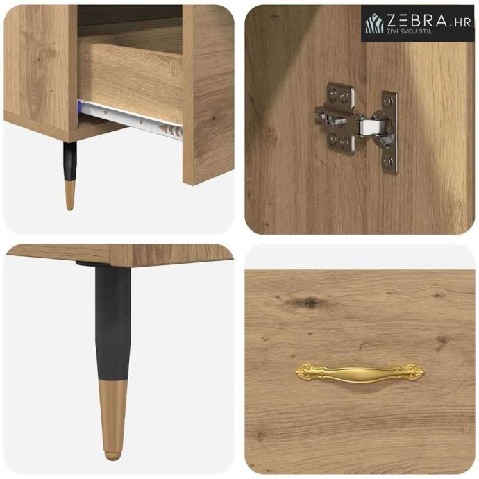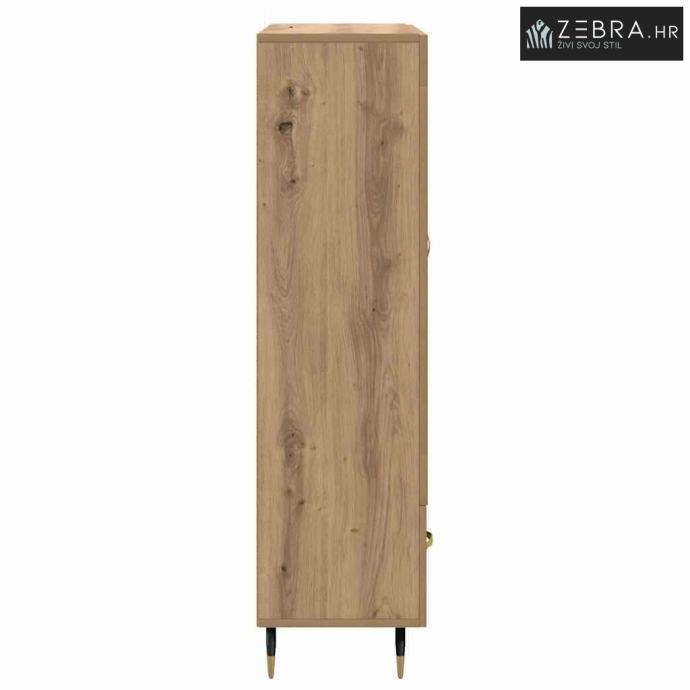 Izgrađeno od inženjerskog drva Visoki ormar je napravljen od kvalitetnog inženjerskog drva, što mu daje otpornost na svakodnevno korištenje. Ovaj materijal je izabran zbog svoje čvrstoće i dugovječnosti, osiguravajući da ormar ostane važan element u vašem domu dugi niz godina. Njegova otpornost znači da zadržava atraktivan izgled čak i uz redovito korištenje. Metalne ručke i noge Zlatne ručke i crne konusne noge dodaju moderni stil i funkcionalnost. Metalni dijelovi dodaju eleganciju dok osiguravaju stabilnost i jednostavnost korištenja, čineći interakciju s prostorijama za skladištenje lakšom i ugodnijom. Police za organizaciju Police omogućuju organizirano skladištenje različitih predmeta. Idealne su za knjige, dekoracije ili posuđe, a olakšava pristup vašim stvarima dok održava uredan prostor. Praktičnost vrata na šarkama Ormar ima praktičan sustav vrata na šarkama, osiguravajući dugotrajnost i jednostavno otvaranje. Ova funkcija poboljšava moderni izgled namještaja. Upute za održavanje Održavajte svoj ormar brisanjem suhom krpom. Pričvrstite ga na zid pomoću uključenih uređaja da spriječite prevrtanje i povećate sigurnost i dugovječnost u vašem prostoru. Boja: Umjetnički hrast