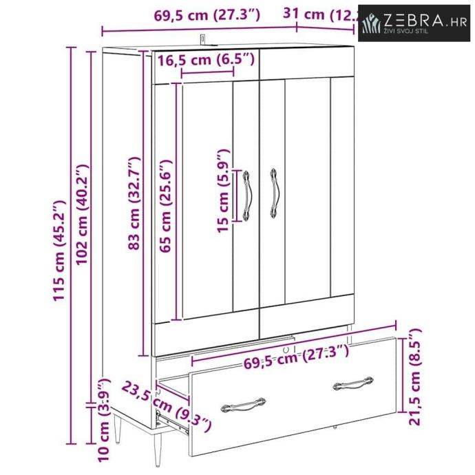 Sveukupne dimenzije: 69,5 x 31 x 115 cm (D x Š x V)