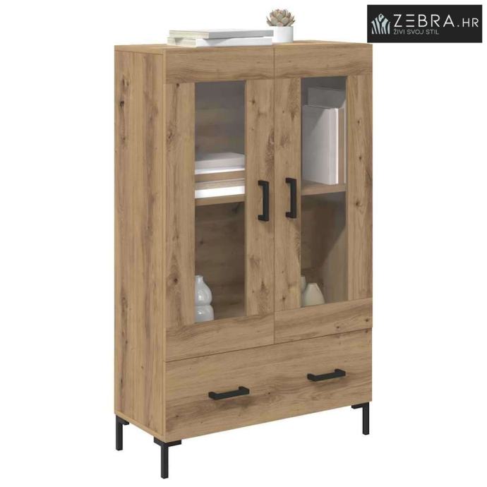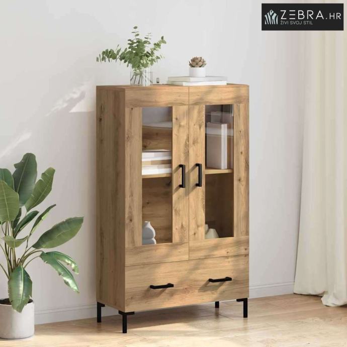 Izdržljivo konstruirano drvo: Highboard je od drva koje je otporno i izdržljivo. Ovaj materijal osigurava da se drži tijekom vremena i dodaje malo elegancije u vašu dnevnu sobu. Ne troši se lako, pa izgleda dobro čak i nakon česte upotrebe. Svestra rješenja za pohranu: S raznim odjeljcima, poput tradicionalnih ladica s ručkama, polica i vrata s šarkama, ovaj highboard pruža različite opcije pohrane za sve vaše stvari. Bilo da drži posuđe, knjige ili dekoracije, jednostavno održava urednost. Sofisticirani metalni dijelovi: Opremljen crnim metalnim nogama i ručkama, highboard nudi modernu i elegantnu estetiku. Ove metalne komponente dodaju stabilnost i izgledaju odlično, čineći ga stylish komadom namještaja. Sigurna visoka gradnja: Highboard dolazi s opremom za pričvršćivanje na zid, što sprječava prevrtanje. Ovo je važno za obitelji s malom djecom ili ljubimcima, jer omogućuje mir dok organizirate visoke dijelove. Minimalistički moderni dizajn: Čiste linije i funkcionalnost highboarda savršeno se uklapaju u moderne interijere. Njegov nenametljiv stil poboljšava svaki prostor, dodajući bezvremensku dodatnu vrijednost vašem domu. Boja: Umjetnički hrast