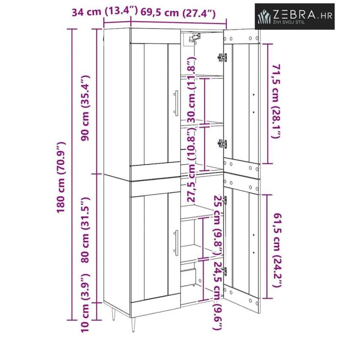 Sveukupne dimenzije: 69,5 x 34 x 180 cm (D x Š x V)