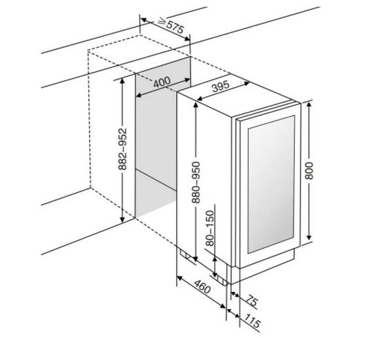 Hladnjak za vino dizajniran je za jednostavnu ugradnju ispod kuhinjskog pulta, a vrata pristaju u ravnini s vratima kuhinjskog elementa za elegantan i neprimjetno integriran izgled.