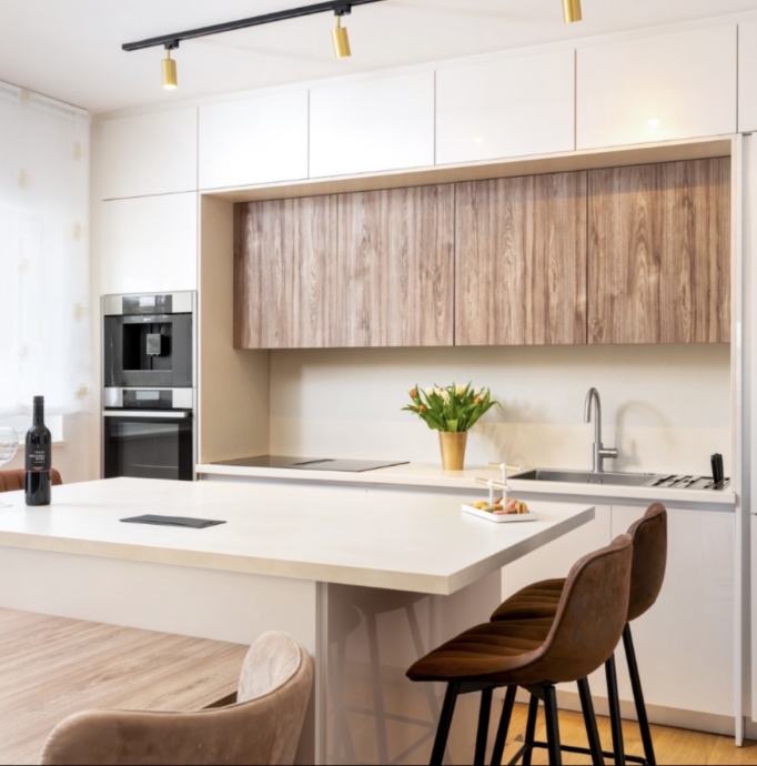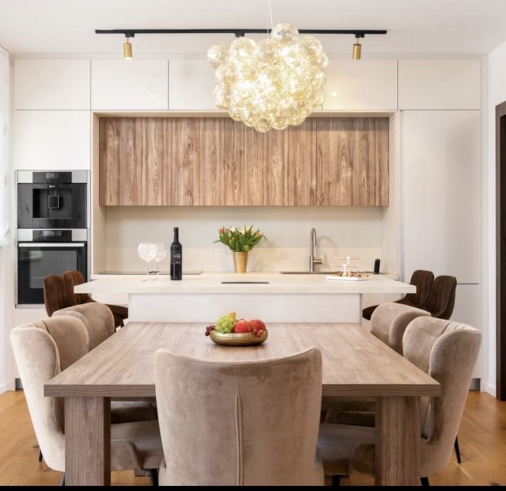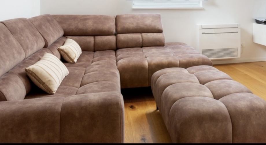 Kuhinja: duzina 3.80,visina 2.65. Vrlo malo koristena,materijal Elgrad,stolarski rad,novo bez ijednog ostecenja. Otok: duzina 1.80,sirina 1.10m,ugradjena uticnica na radnoj povrsini. U sredini tri ladice sa svake strane po element. Cijena kuhinje je 3500€.Garnitura je duzine 3m,dubina 1.10m,kut duzina 1.35m. Elektricno razvlacenje,naslon za glavu u tri nivoa podizanje. Tabure je duzine 1.30,sirina 0.70m. Cijena garniture je 1000€. Stanje kao novo. Stol za terasu sa osam stolica,aluminijski,duzina 2.40,sirina 1.02. Stolice su od materijala koji ne upija vodu. Cijena stola sa stolicama je 1000€.